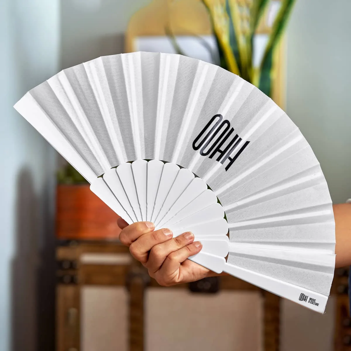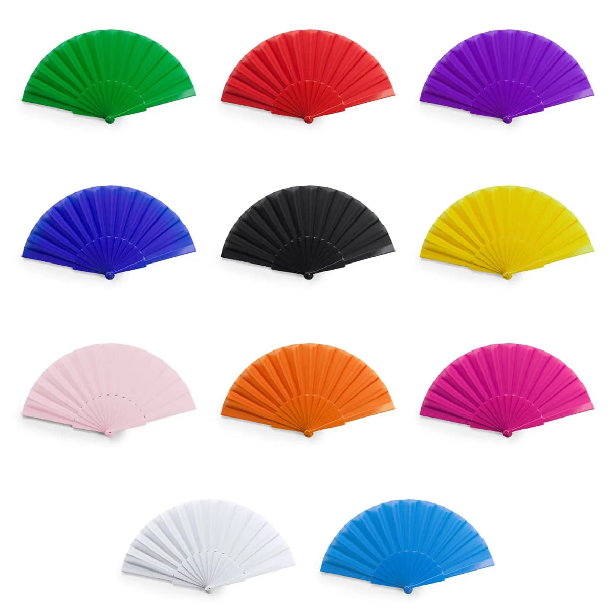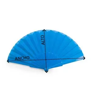 Abanico con varillas de plástico y tela en poliéster. Presentación en caja blanca.