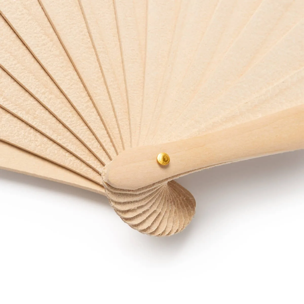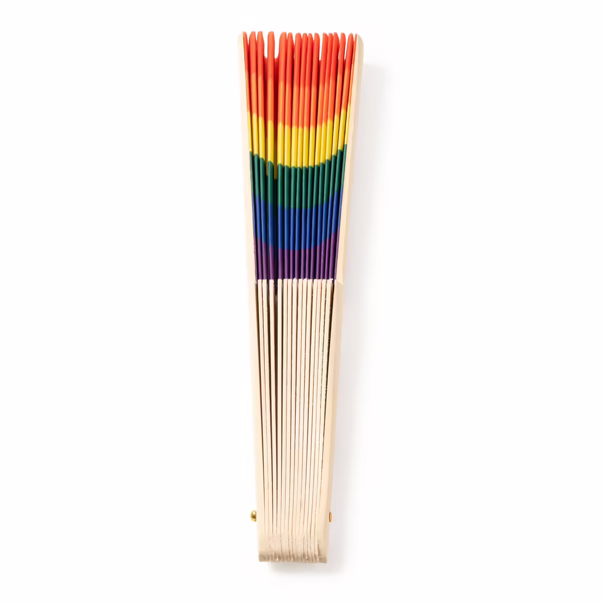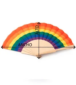 Abanico con varillas de madera y tela con estampado multicolor.