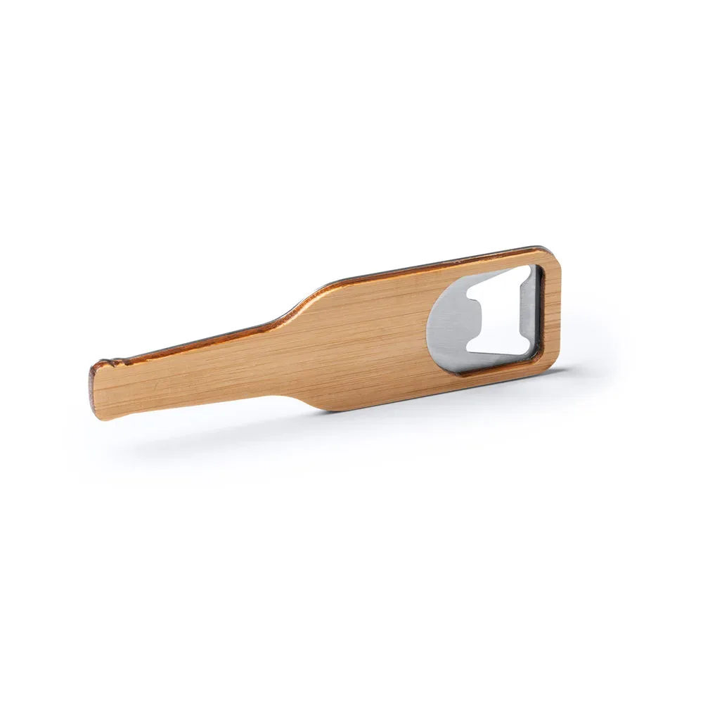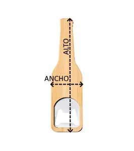 Abridor con forma de botella. Cuerpo de bambú y metal con imán.