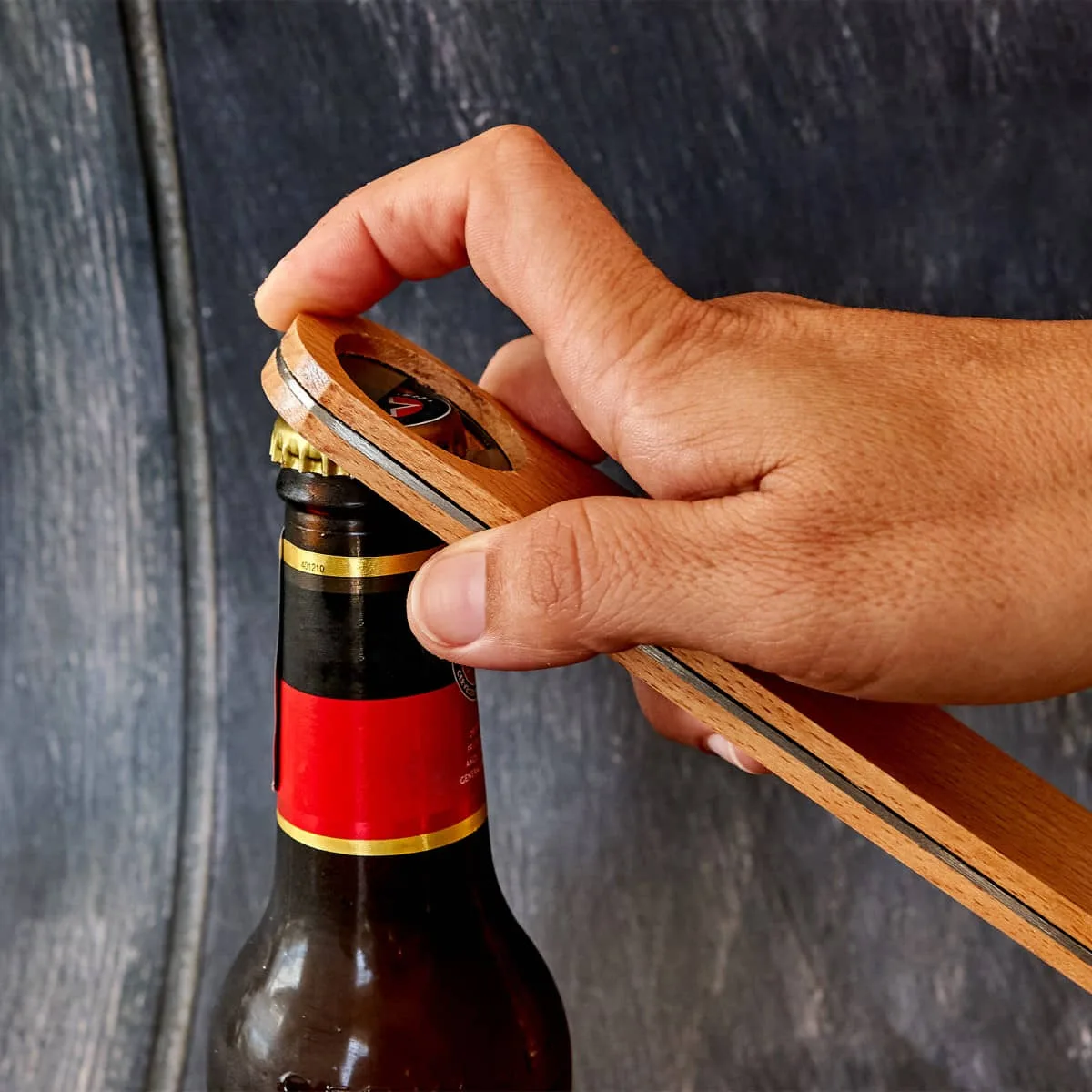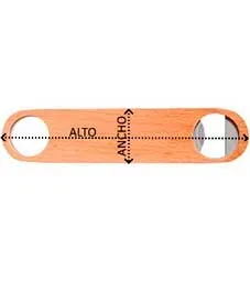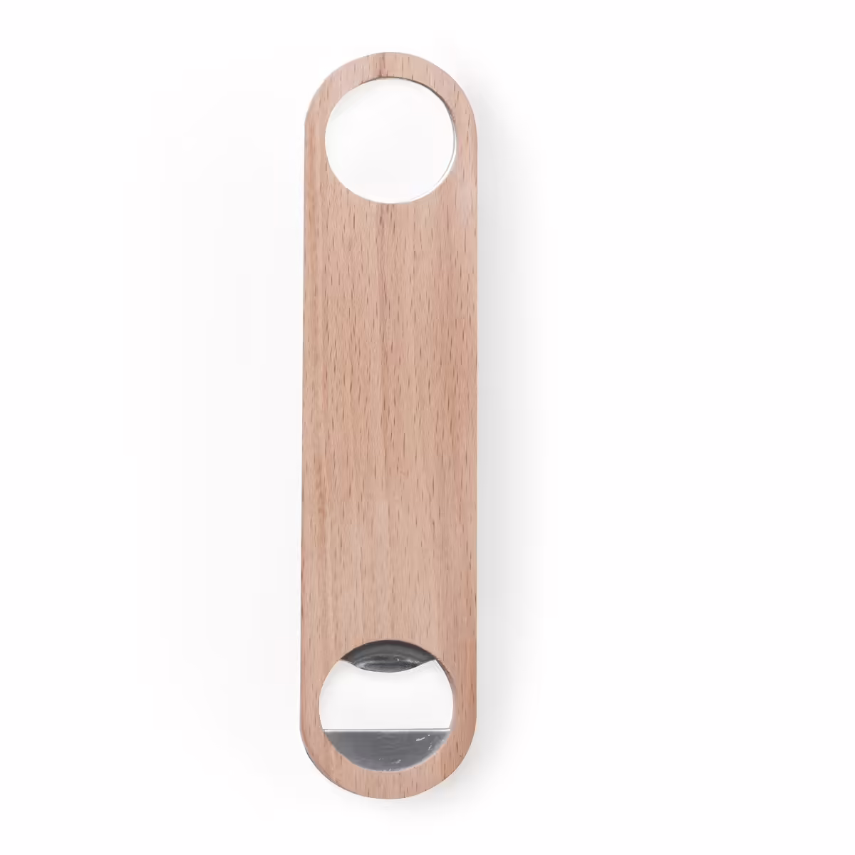 Abridor alargado línea nature, con un orificio en cada extremo: uno con función abridor y otro como colgador. Realizado en madera natural con interior de acero inox.