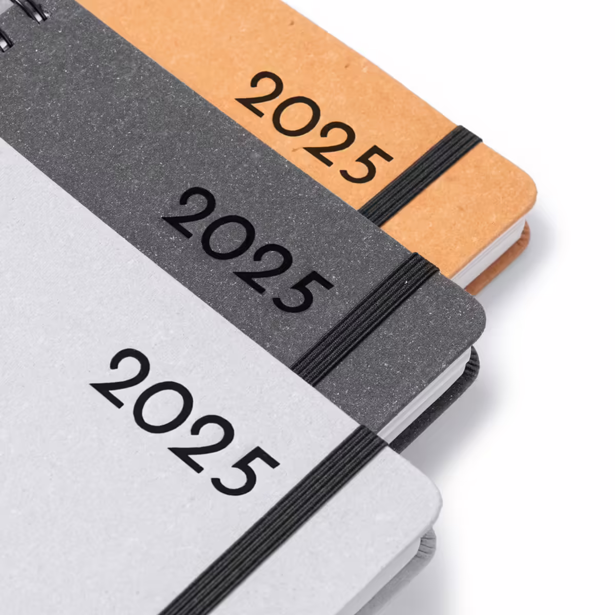 Agenda con anillas tamaño A5, con tapas de cuero reciclado grabadas en bajo relieve y banda elástica. Cuenta con 348 páginas de papel blanco y 4 páginas adicionales con mapas. Ideal para mantener tus notas organizadas con estilo y durabilidad.