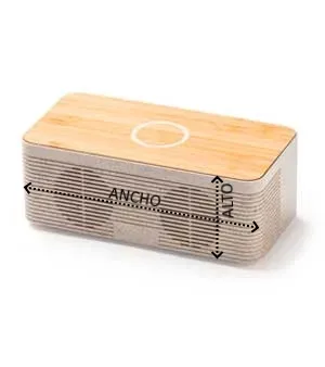 Altavoz bluetooth con base de carga inalámbrica. Cuerpo de fibra de trigo y superficie de bambú natural. 5W de potencia de altavoz y salida inalámbrica de DC5V. Batería recargable.