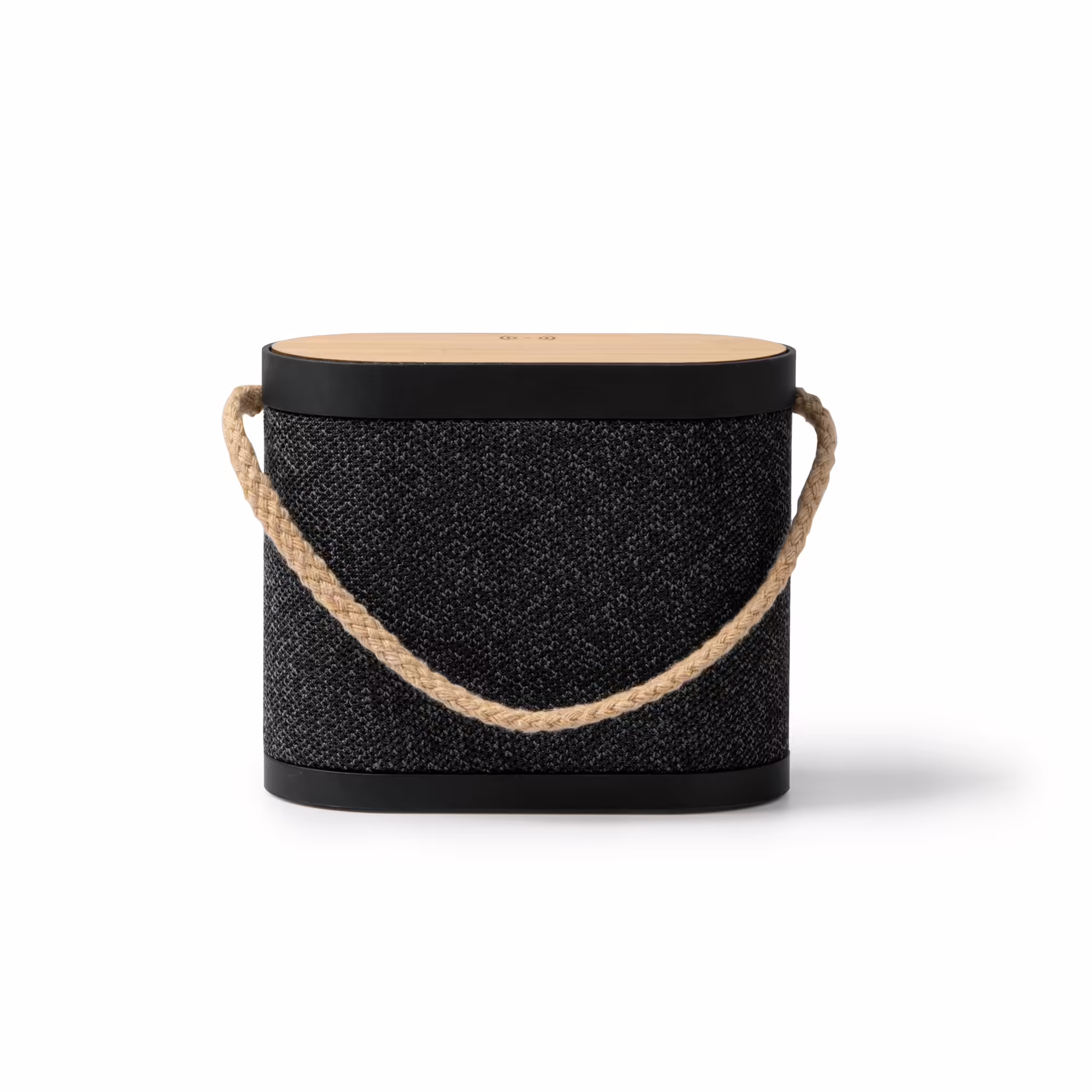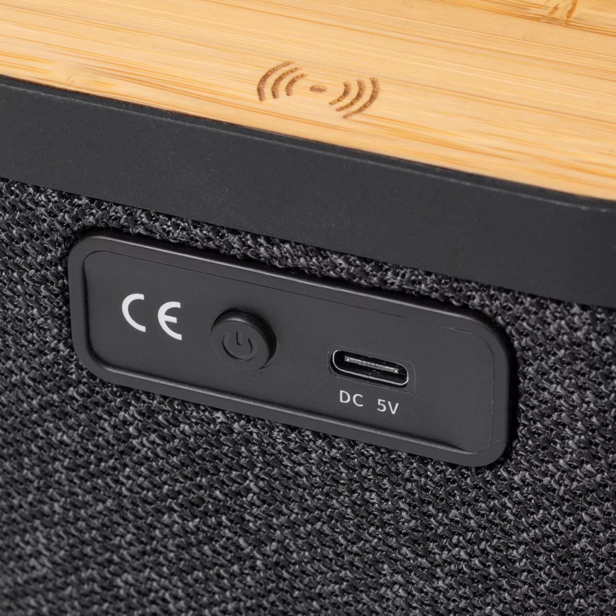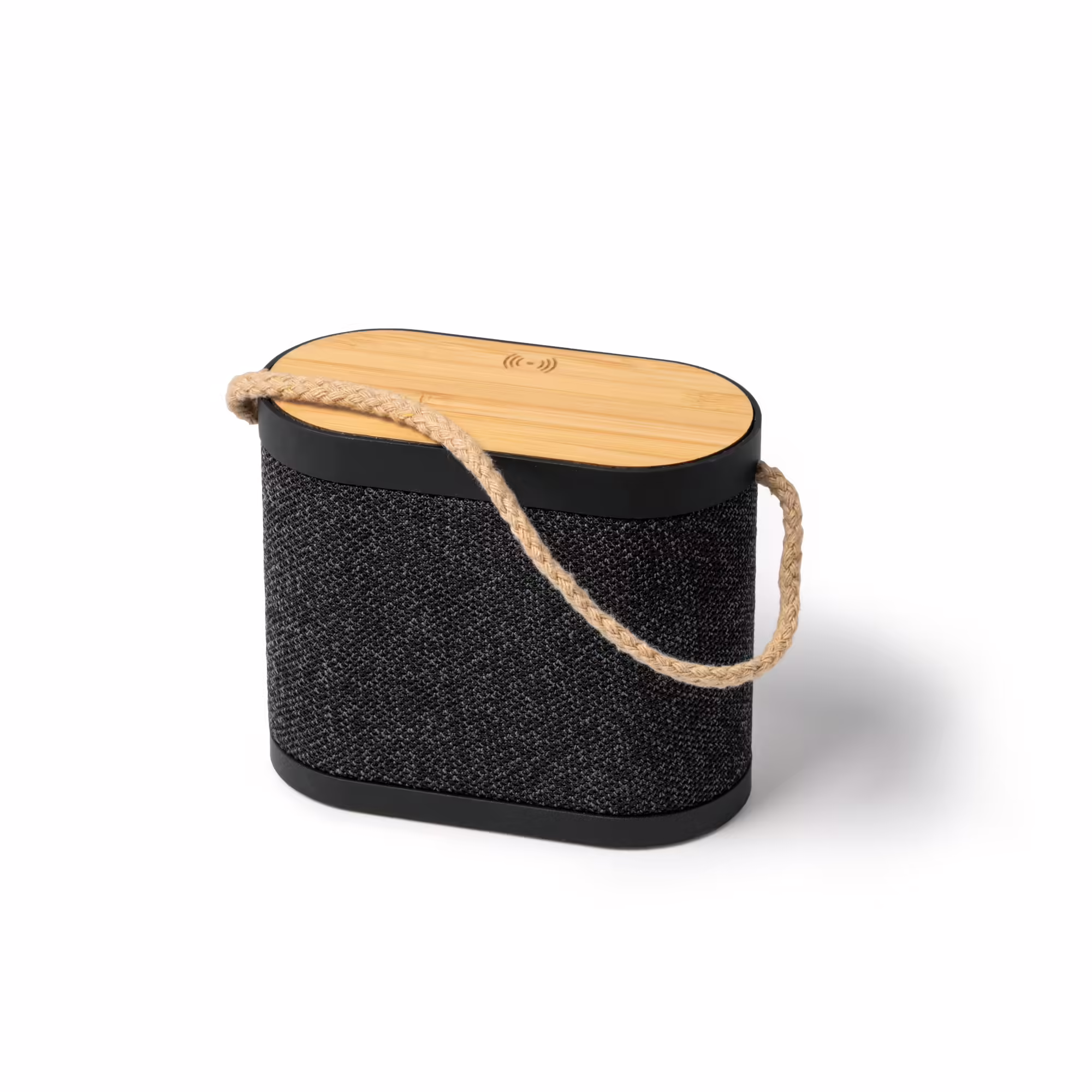 Altavoz inalámbrico con un cuerpo de bambú y poliéster reciclado RPET, ofreciendo 5W de potencia. Incluye un cargador inalámbrico de 15W para mayor conveniencia. Viene con una cómoda asa de transporte de algodón y conexión Tipo C. El cable está incluido. Todo el conjunto se presenta en una caja con diseño ecológico, perfecta para quienes buscan sostenibilidad y estilo en un solo producto.