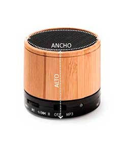 Altavoz inalámbrico Bluetooth con cuerpo de bambú natural. Función radio FM, manos libres, ranura para tarjeta Micro SD. 3W de potencia. Batería recargable. Cable incluido.