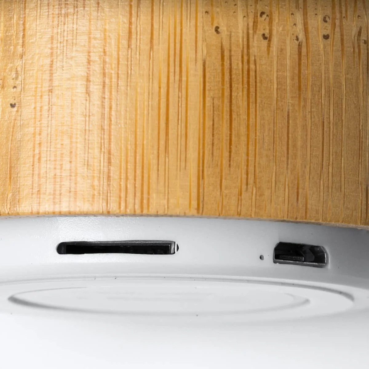 Altavoz inalámbrico redondo con cuerpo de ABS blanco y bambú natural. Botones y rejilla en color blanco. Función radio FM, manos libres, ranura para tarjetas mini SD y potencia 3W. Batería recargable. Cable incluido. Base anti-deslizante.