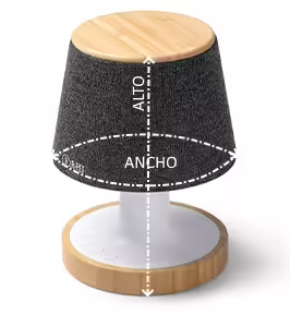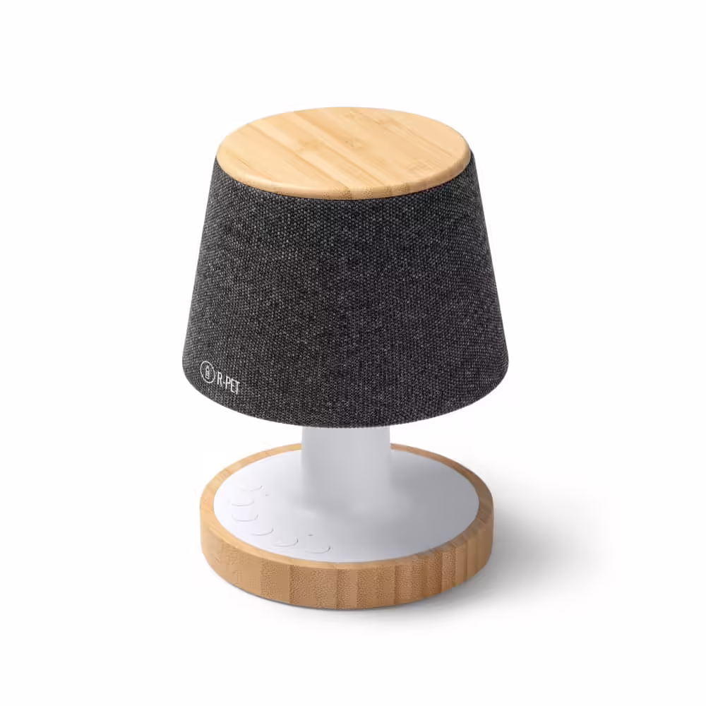 Lámpara altavoz de 5W realizada en poliéster reciclado con detalles en bambú. Modos de luz led: blanca, neutra y cálida. El altavoz incorpora 6 sonidos relajantes. Incluye cable tipo C.