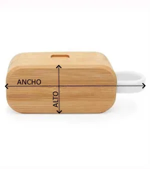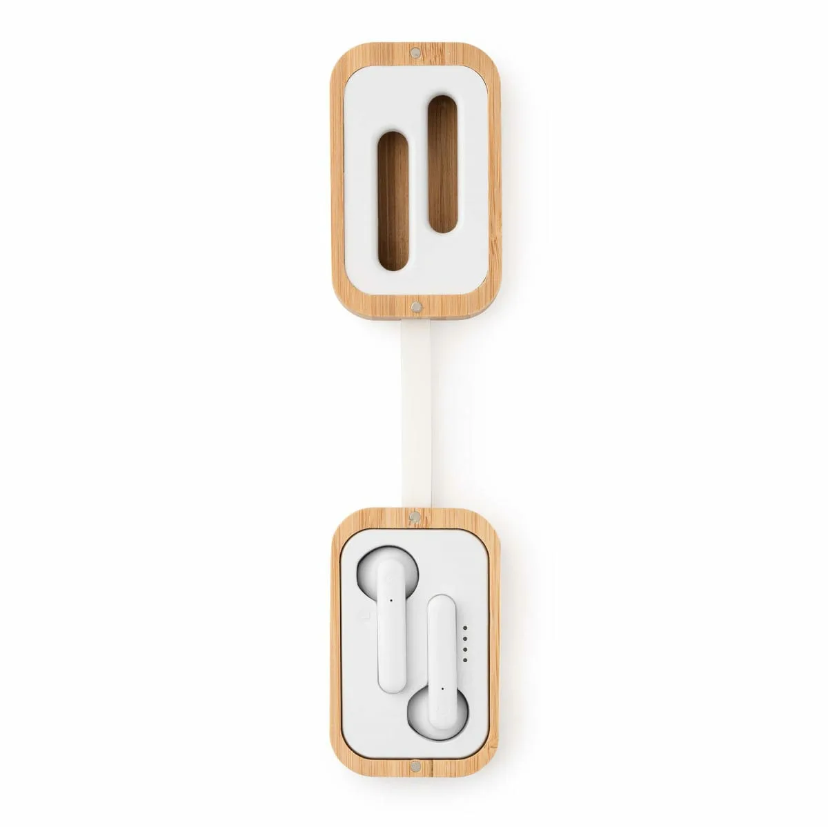 Auriculares inalámbricos Bluetooth 5.0 con estuche de carga en bambú natural. Botón multifunción integrado en ambos auriculares. Función manos libres. Batería recargable. Cable incluido. Presentación en caja diseño eco.