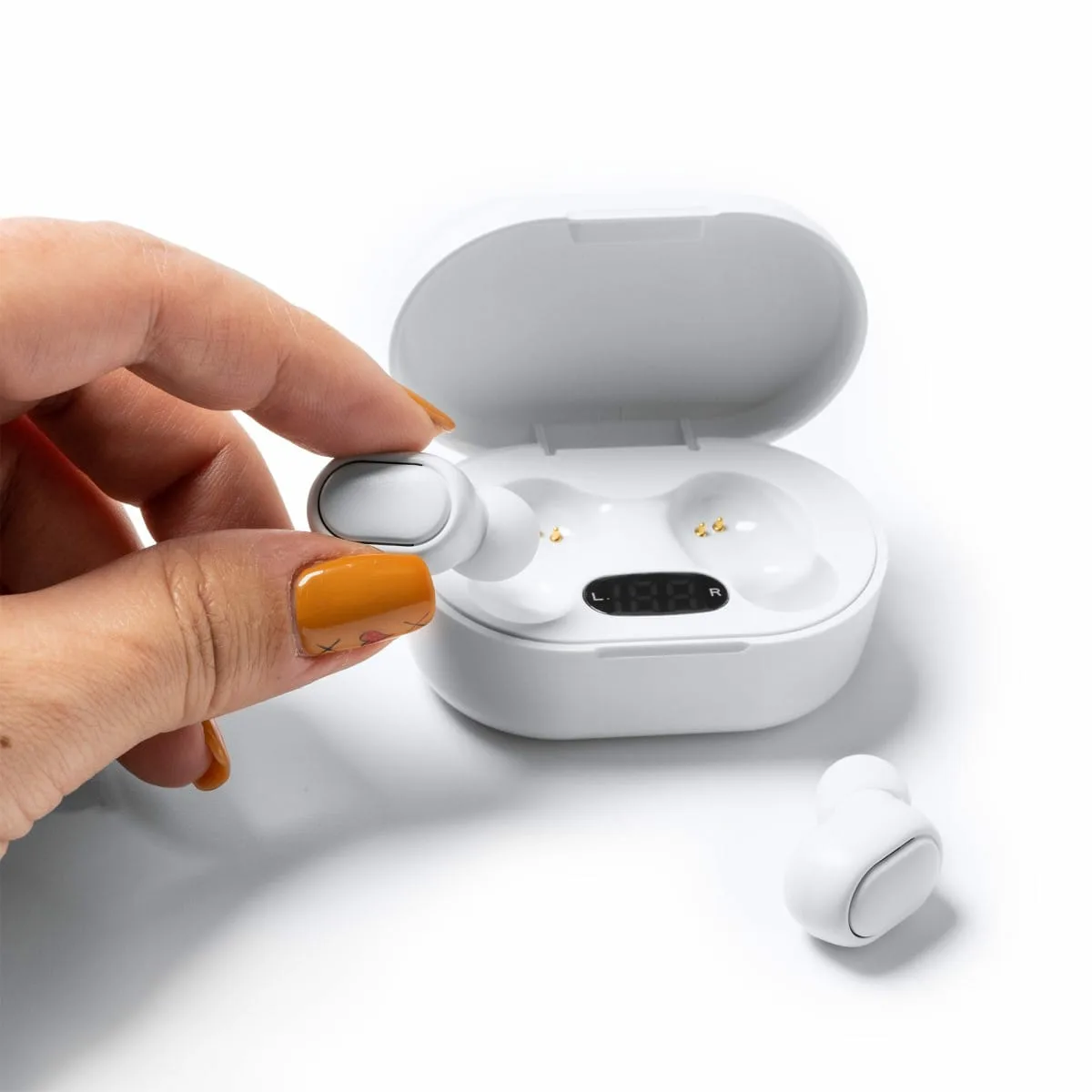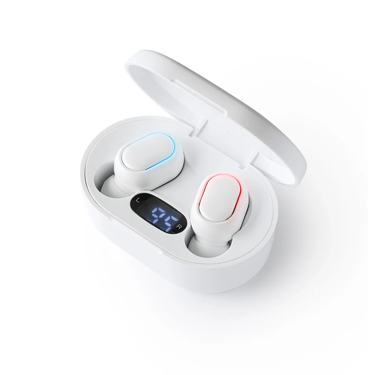 Auriculares inalámbricos Bluetooth 5.0 con estuche de carga. Indicador de carga LED en el estuche y botón multifunción integrado en ambos auriculares. Función manos libres. Estuche con batería recargable y tapa. 3-4 horas de duración. Cable incluido. Pres