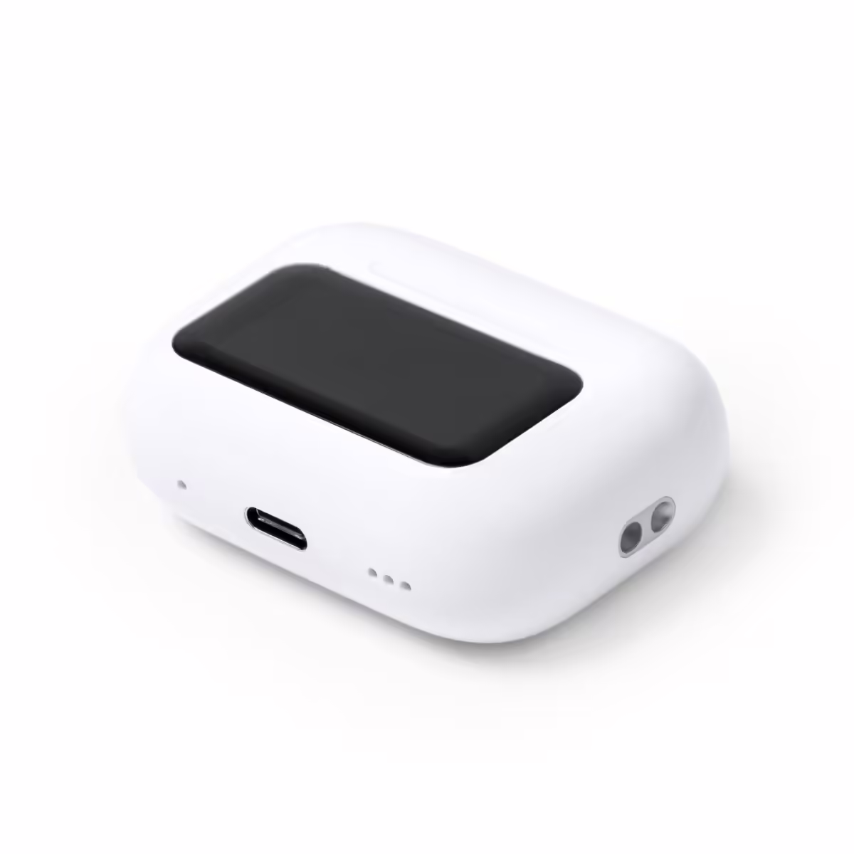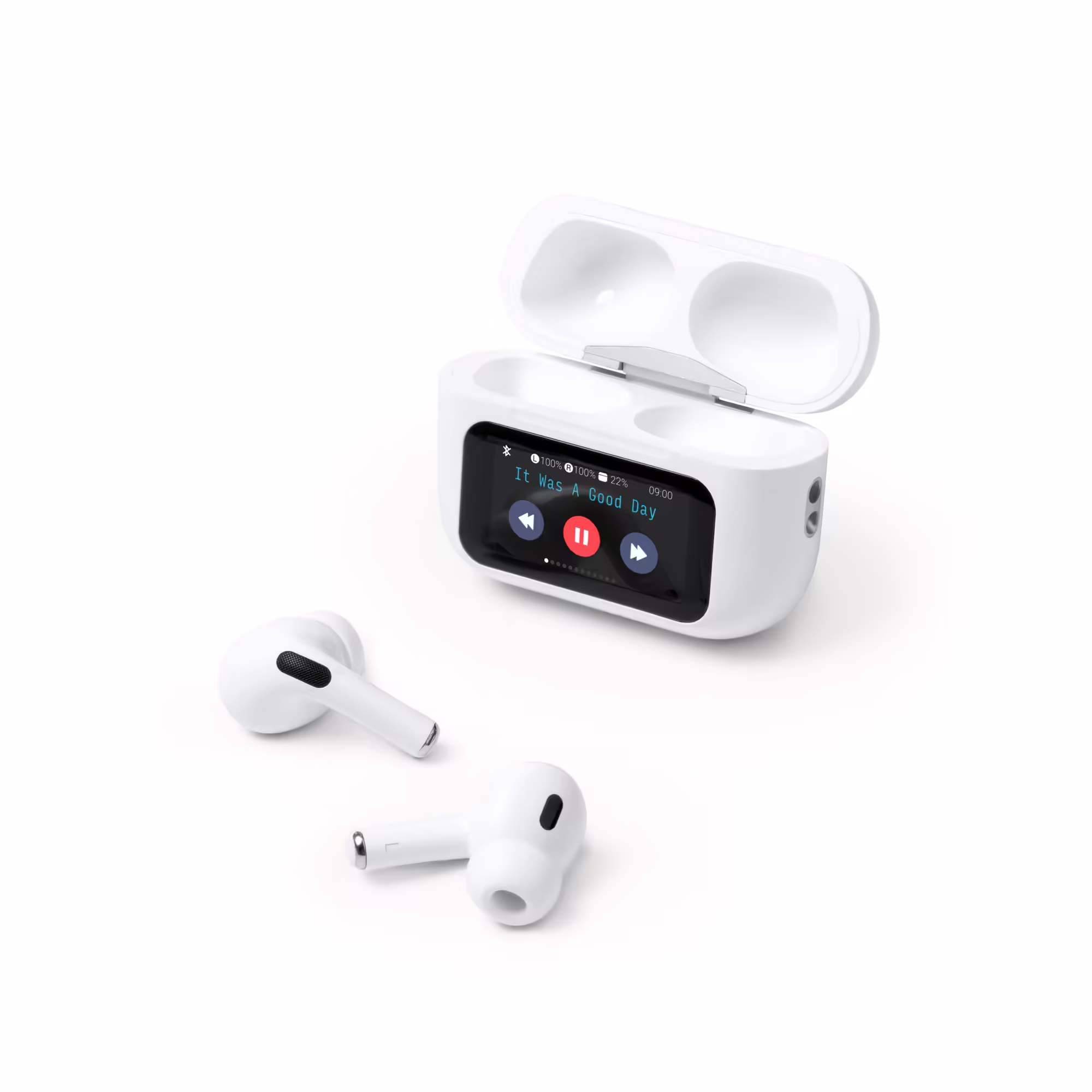 Auriculares inalámbricos presentados en una elegante caja de estuche con pantalla táctil, ofreciendo diversas funciones como control de los auriculares, pasar canciones, recibir llamadas entrantes y acceso a asistente de voz, entre otras. Incluyen modos de cancelación de ruido y transparencia para una experiencia auditiva superior. La batería es recargable y viene con un cable Tipo C incluido. Perfectos para quienes buscan comodidad y tecnología avanzada en su uso diario.