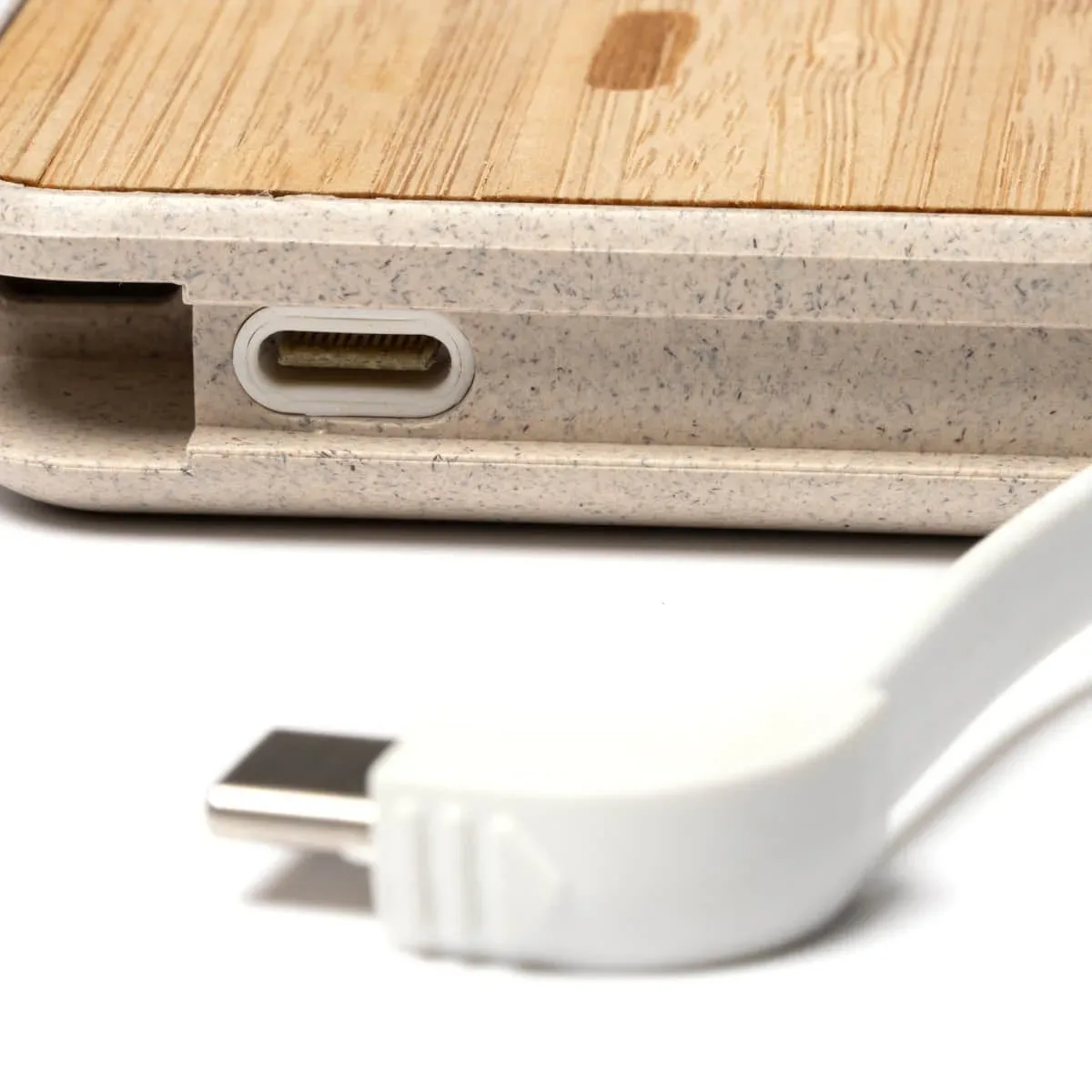 La batería externa de 5000 mAh con cuerpo de bambú y fibra de trigo y cargador inalámbrico magnético es una opción compacta y ecológica para mantener tus dispositivos cargados sobre la marcha. Con su capacidad de 5000 mAh, brinda una carga confiable para tu smartphone u otros dispositivos.