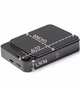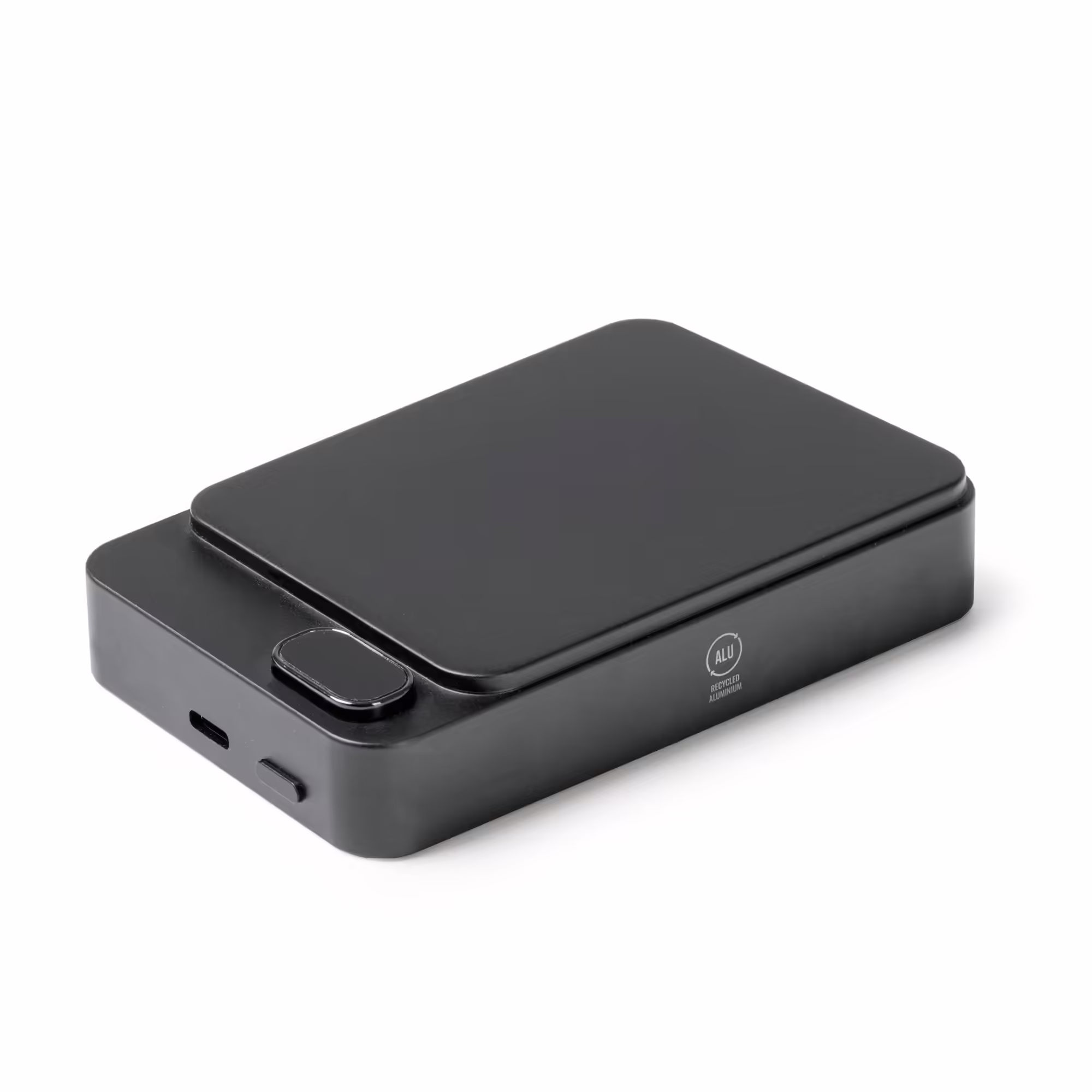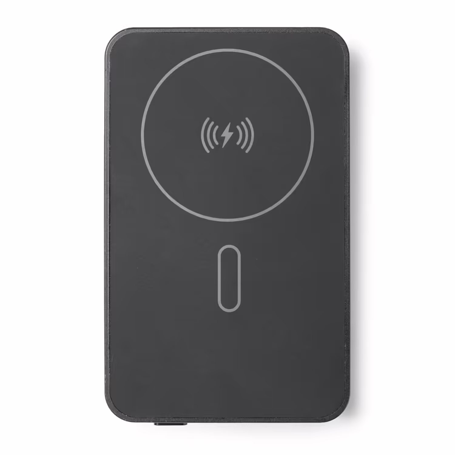 Batería externa magnética de 10000 mAh con función de carga inalámbrica. Pantalla indicadora del porcentaje de carga. Cuerpo de aluminio reciclado. Salida corriente 15W. Incluye cable tipo C y anillo magnético. Presentación en caja diseño eco.