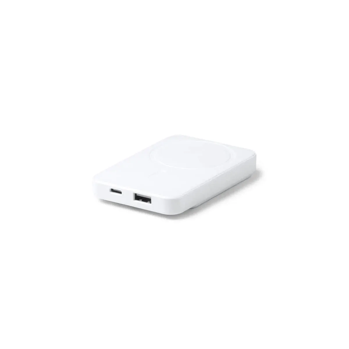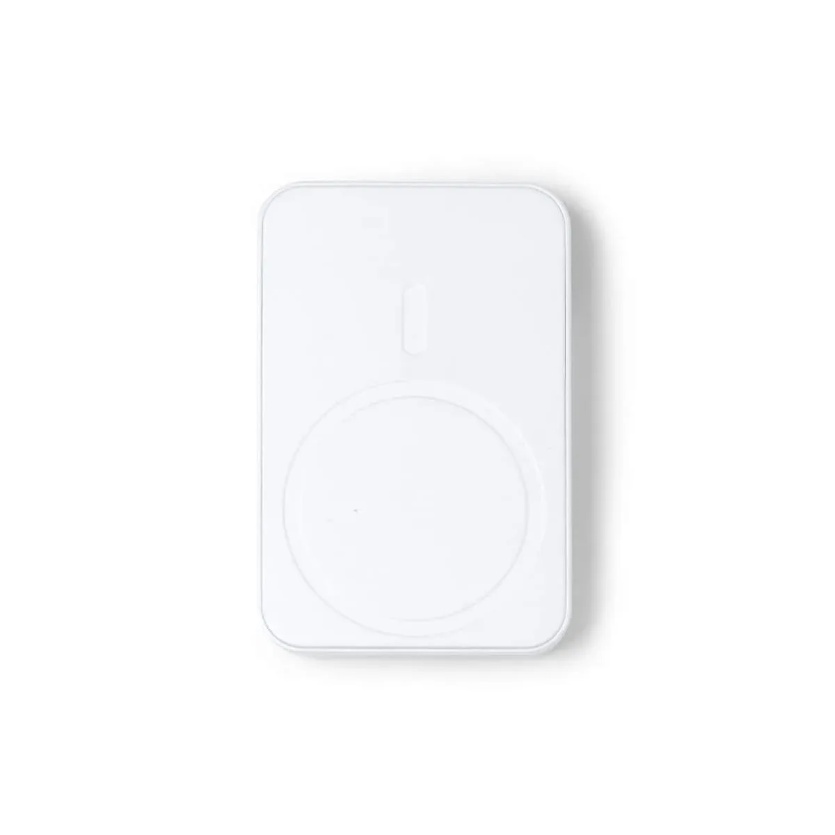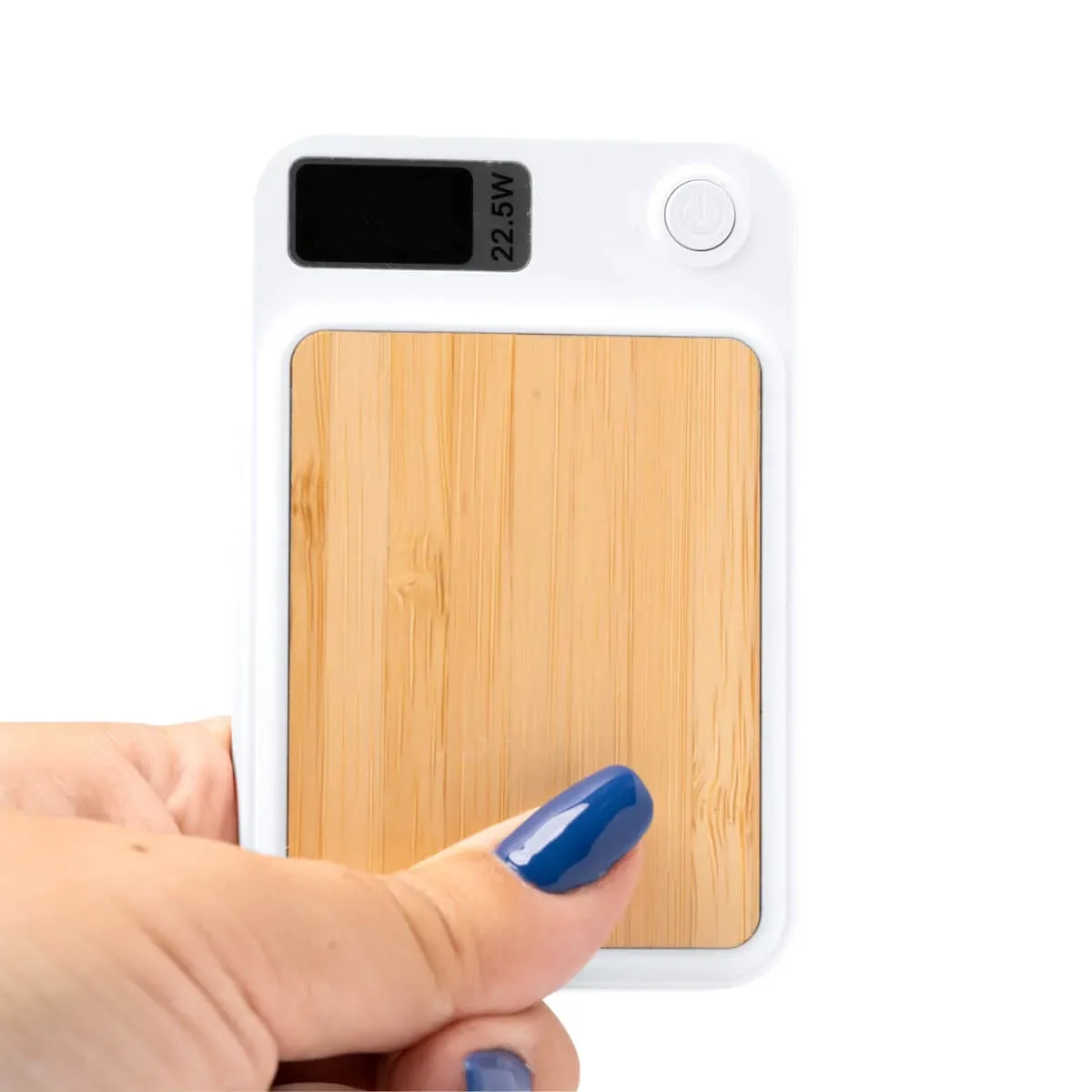 Batería externa realizada con cuerpo de bambú y ABS reciclado. Capacidad 5000 mAh con función magnética de 15W. Pantalla led que indica porcentaje de batería. Incluye anillo accesorio adhesivo.