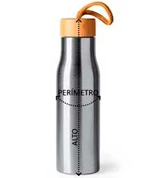 Bidón de acero inoxidable 304 con tapón de bambú. Incluye cinta para transporte. 600 ml de capacidad.