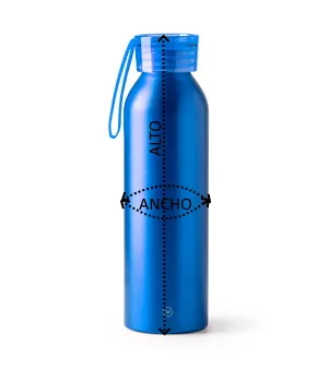 Bidón de aluminio reciclado con tapón y cinta de transporte a juego. Capacidad de 600 ml. Bidón elaborado con material ecológico, concienciado con el medioambiente.