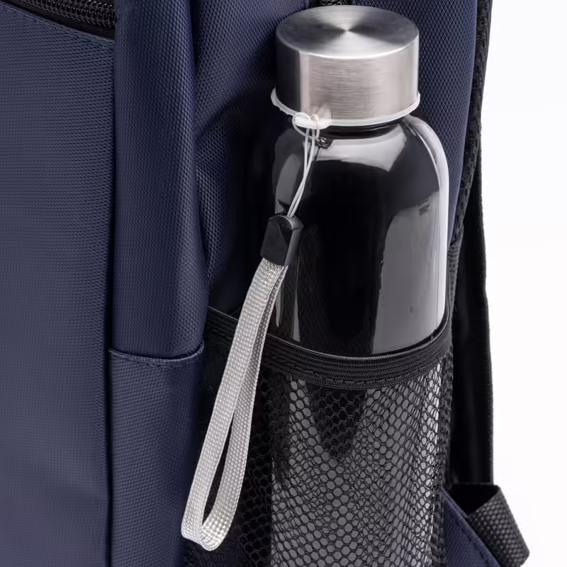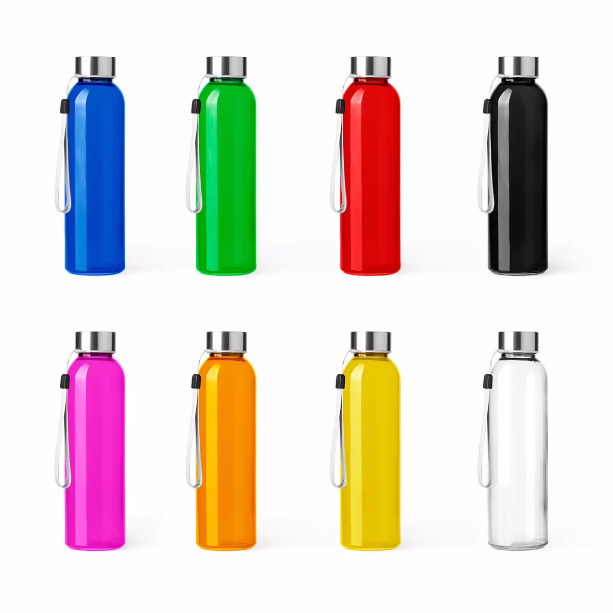 Bidón de cristal disponible en varios colores, con tapa enroscable de acero inoxidable y cinta de transporte en color gris.