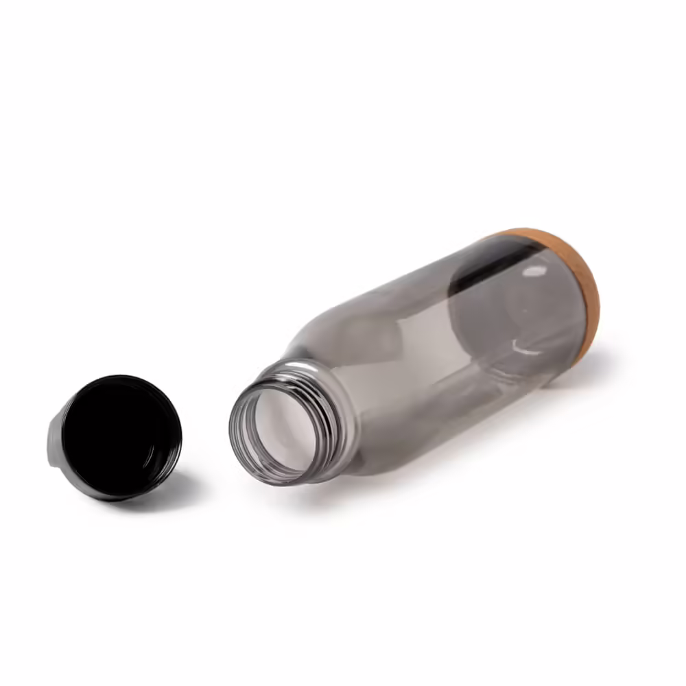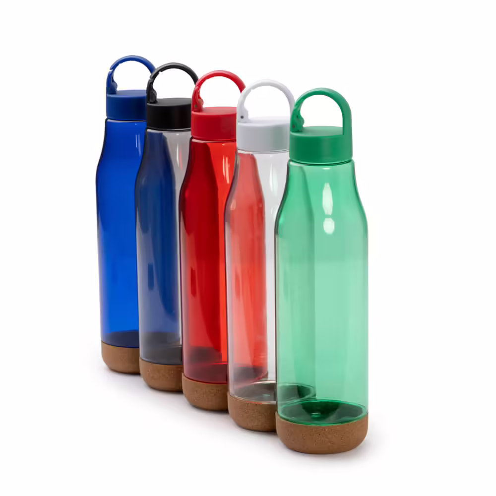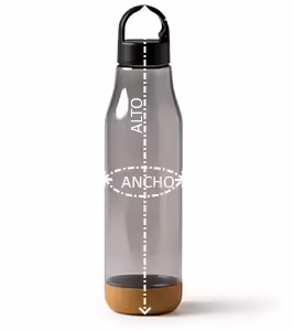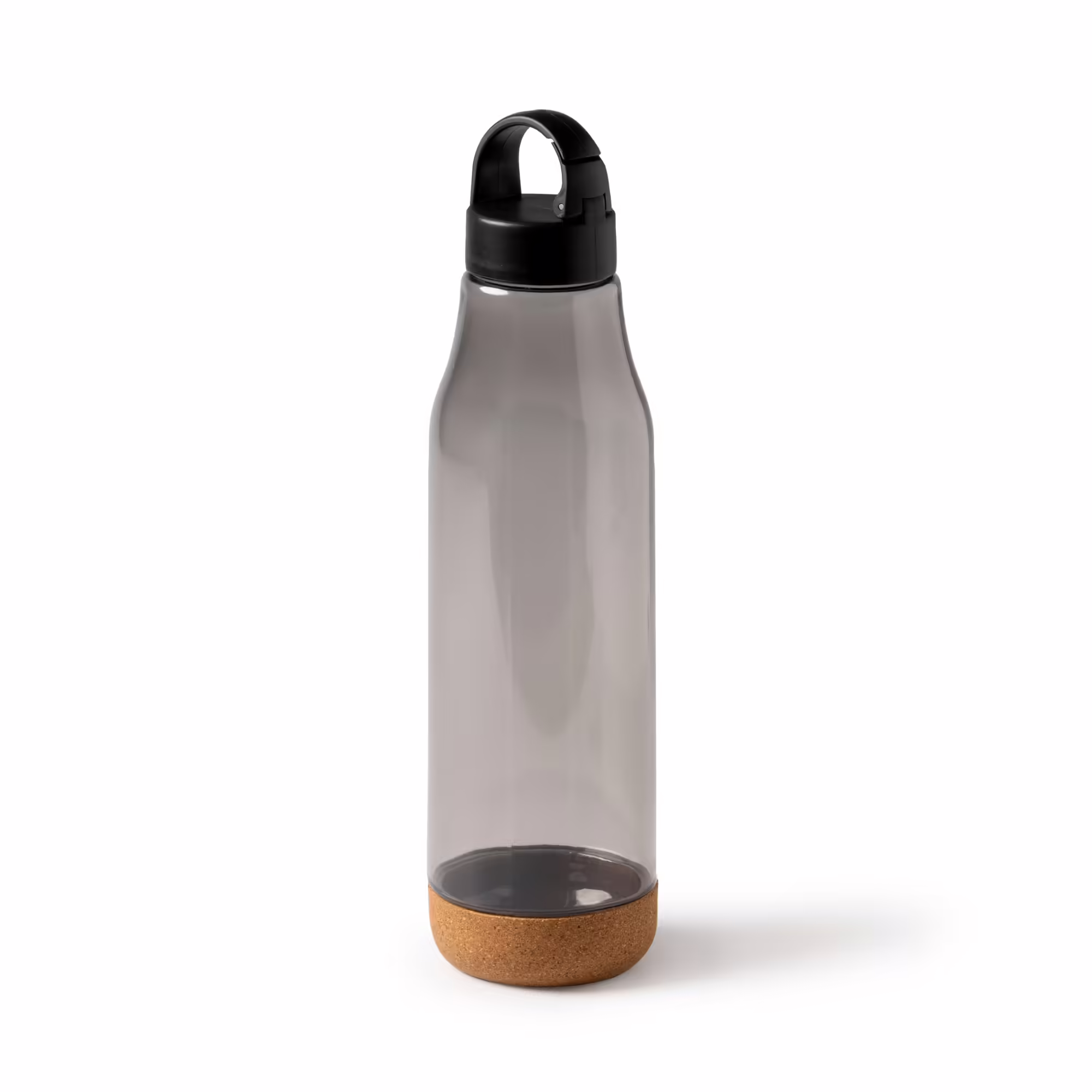 Botella con cuerpo de RPET y base de corcho. Asa de transporte con mosquetón en la tapa. Capacidad 720 ml.