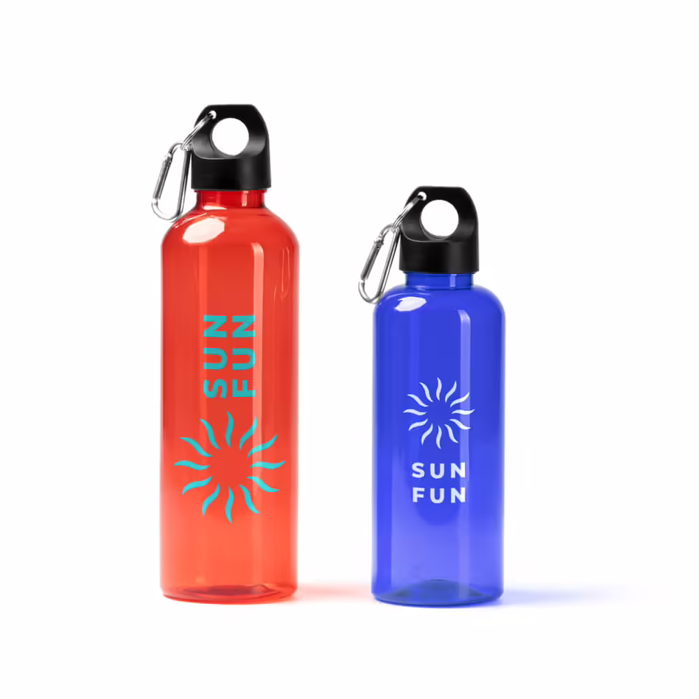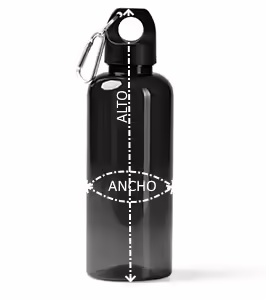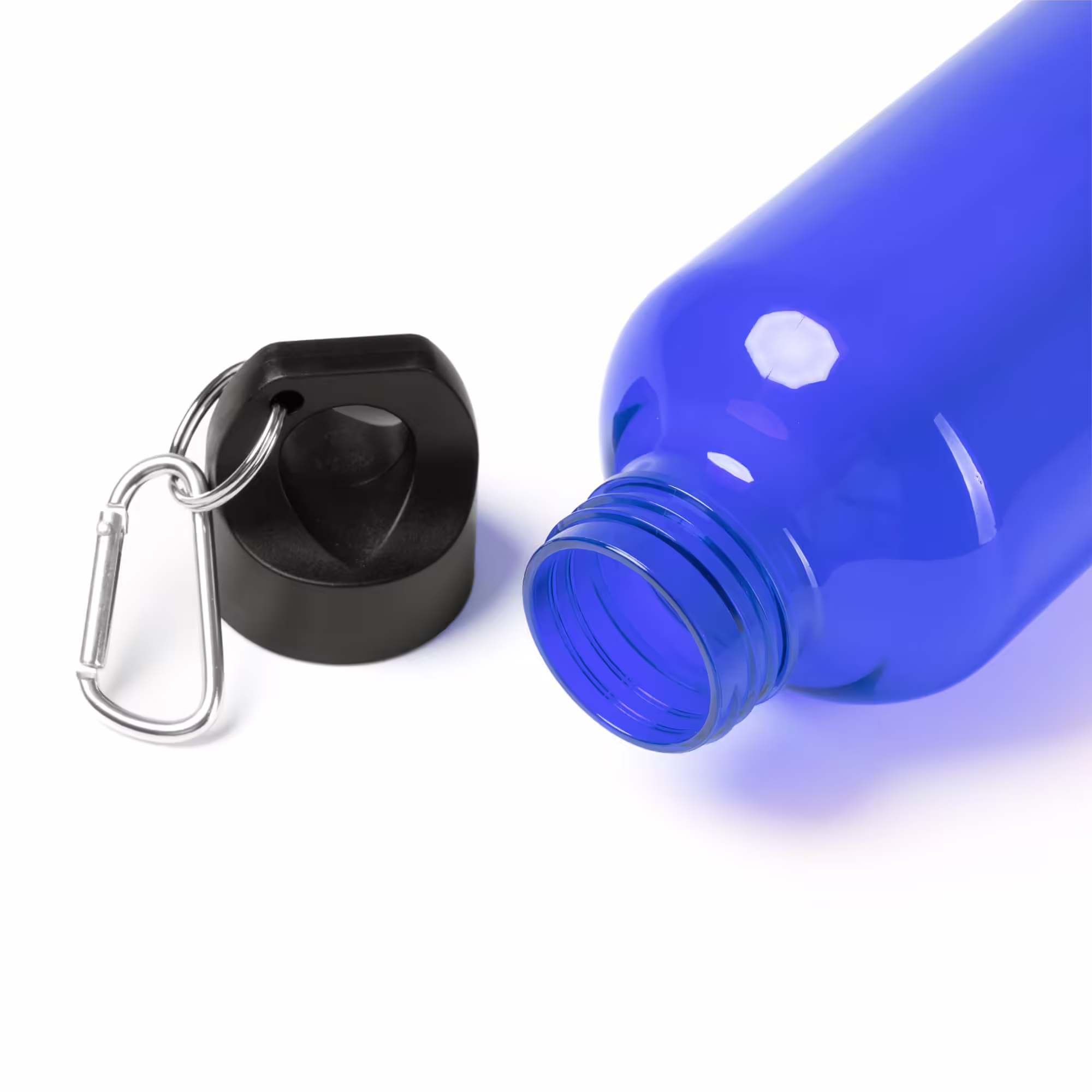 Botella con cuerpo de RPET. Tapa y asa de transporte con mosquetón. Capacidad 580 ml.