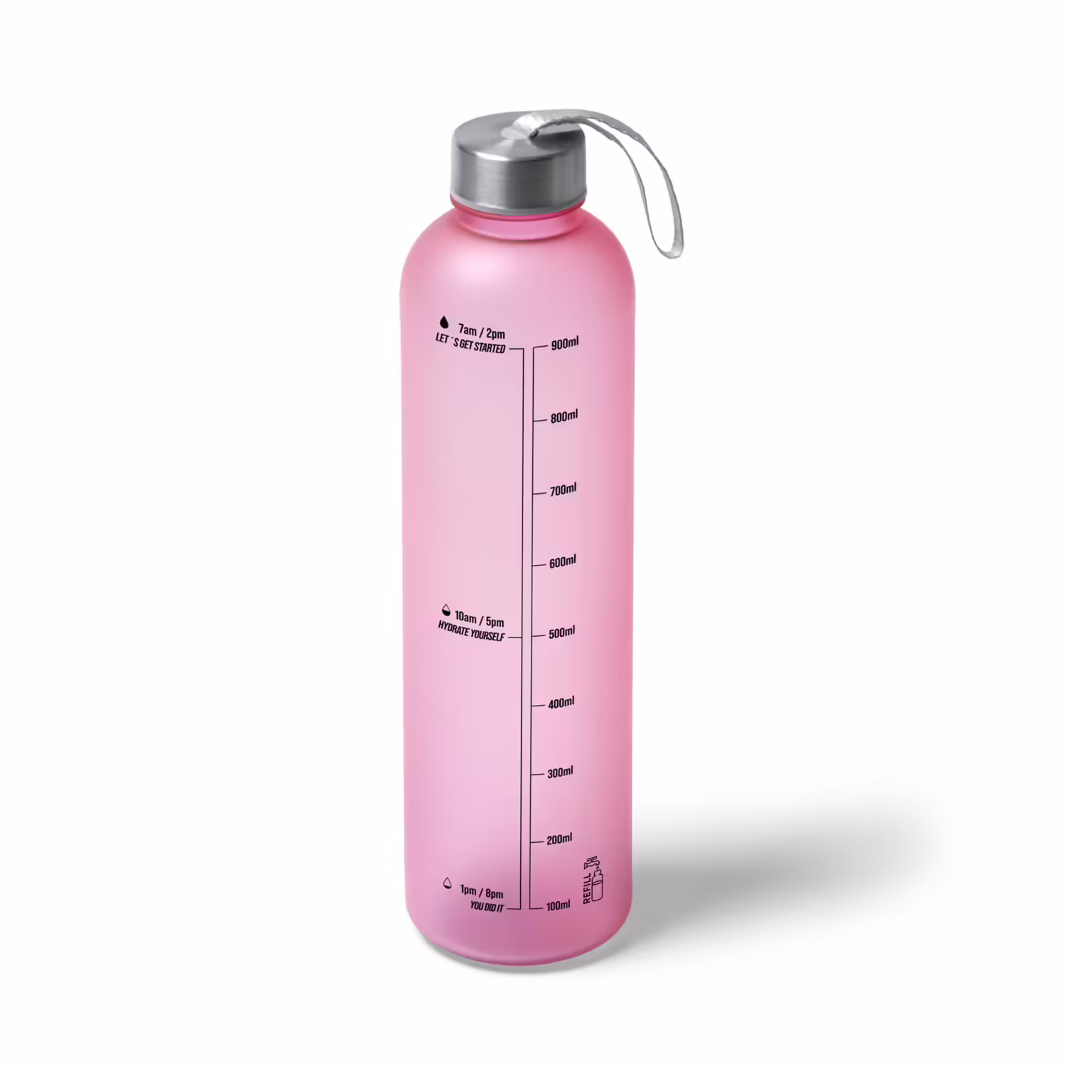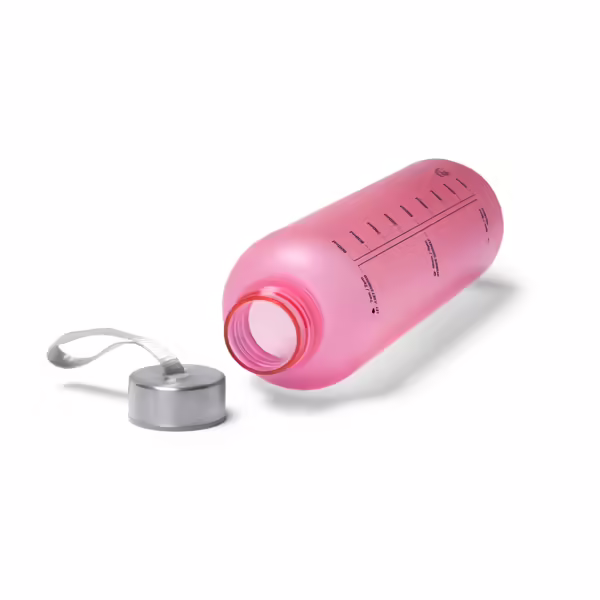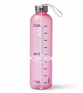 Bidón de tritán con cuerpo translúcido, tapón con cierre a rosca y asa de transporte. Incorpora recomendación de hidratación e indicador de capacidad. Capacidad 1L