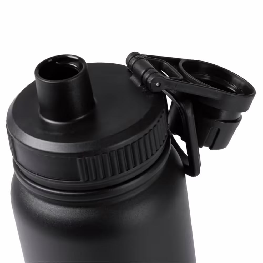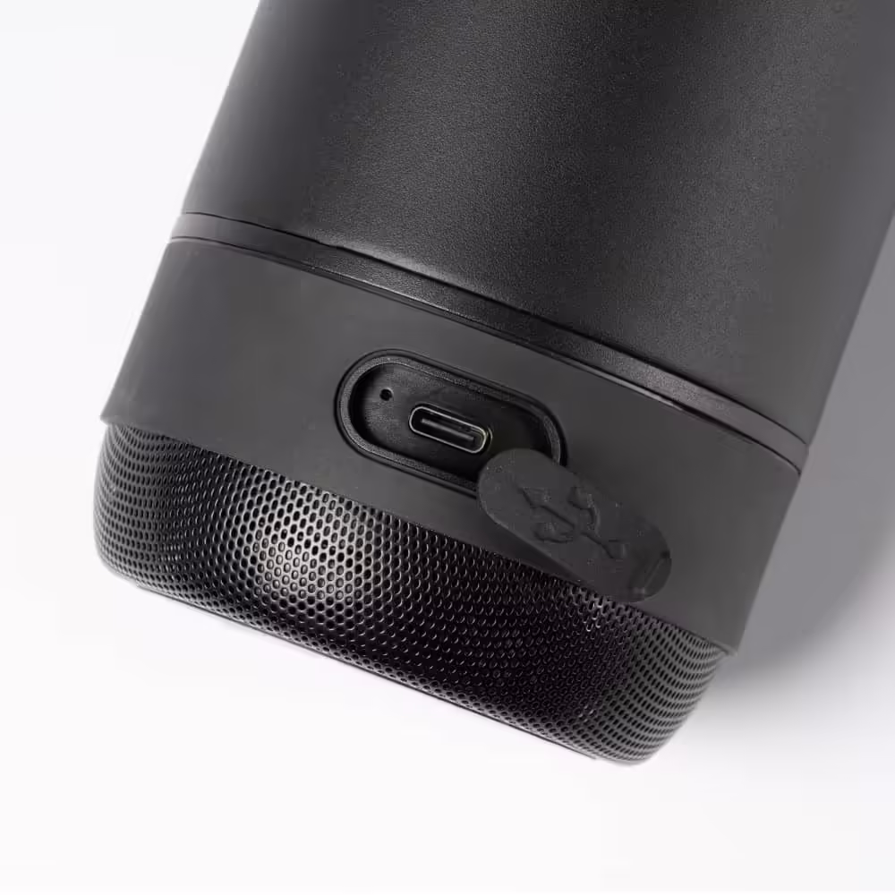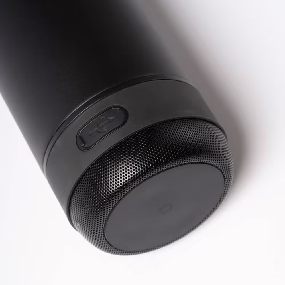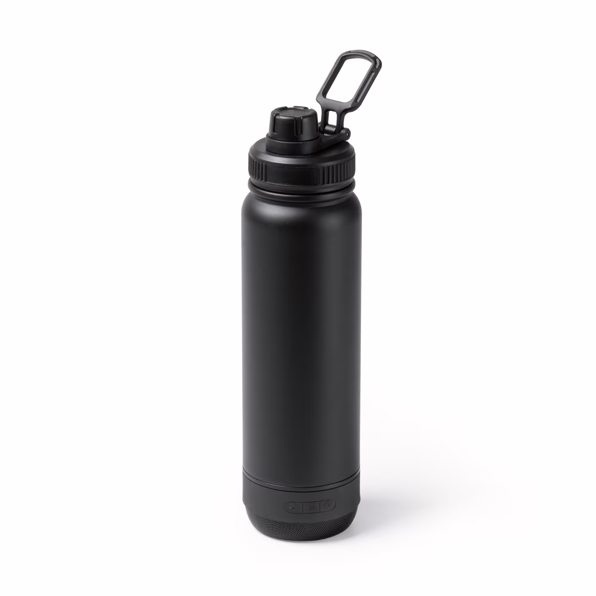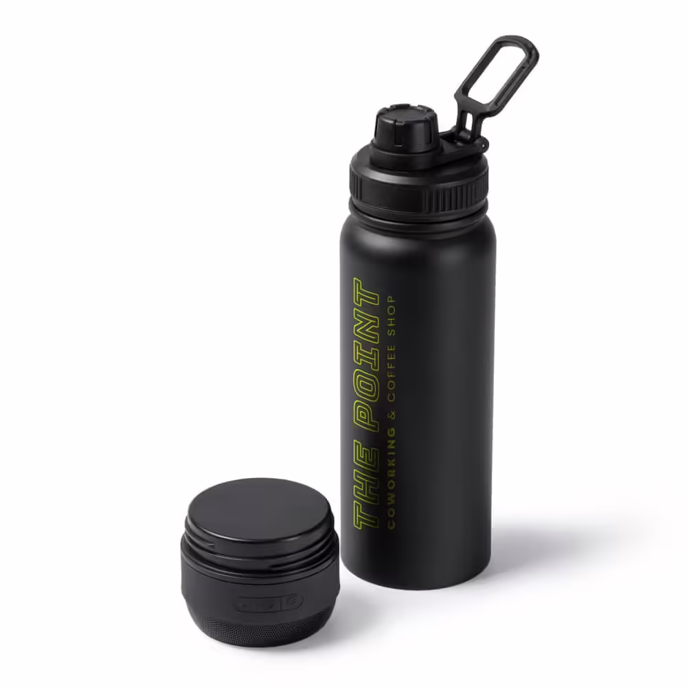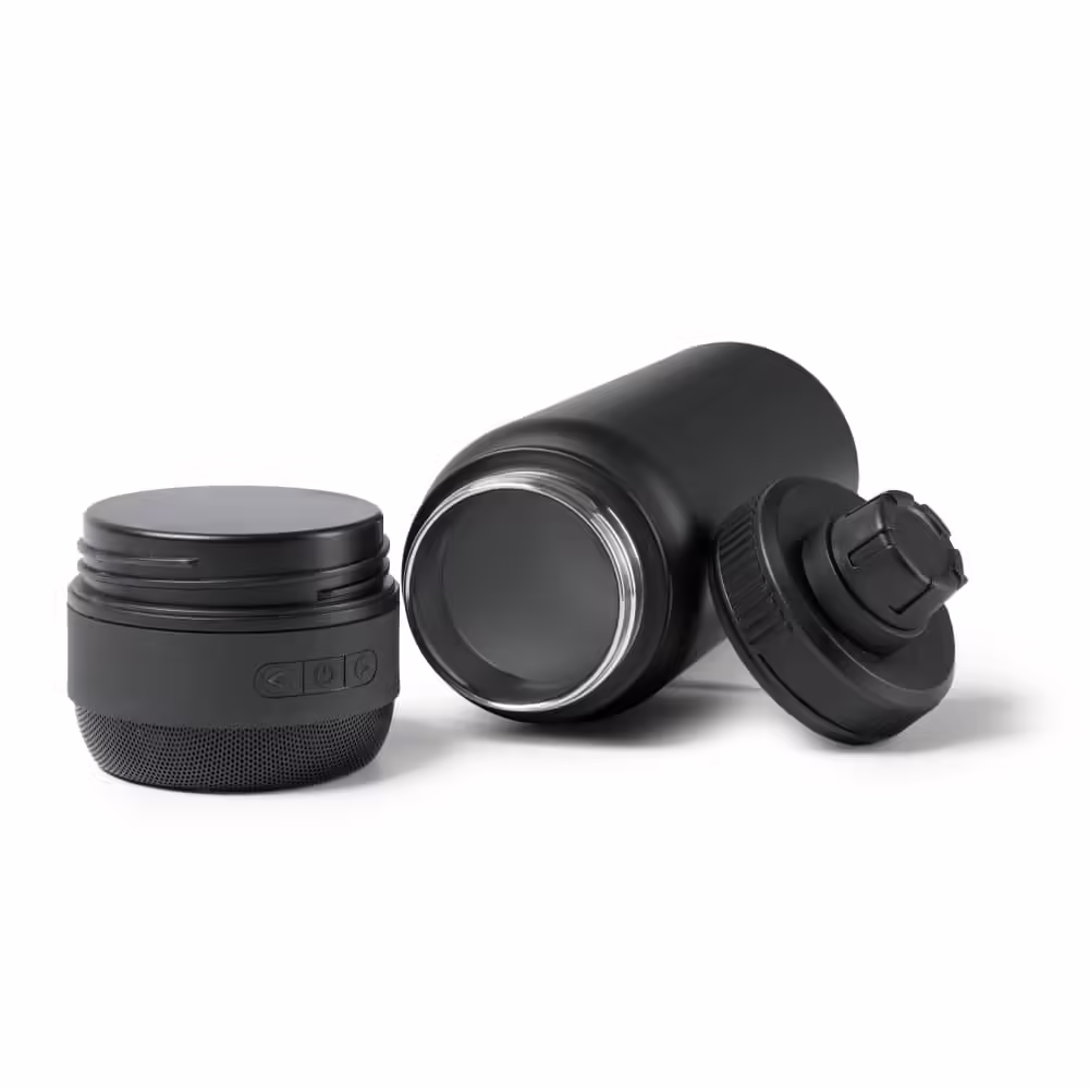Bidón térmico de acero inoxidable 304 de doble pared con altavoz extraíble de 3W. Tapa con asa de transporte. Capacidad 650 ml. Incluye cable tipo C.