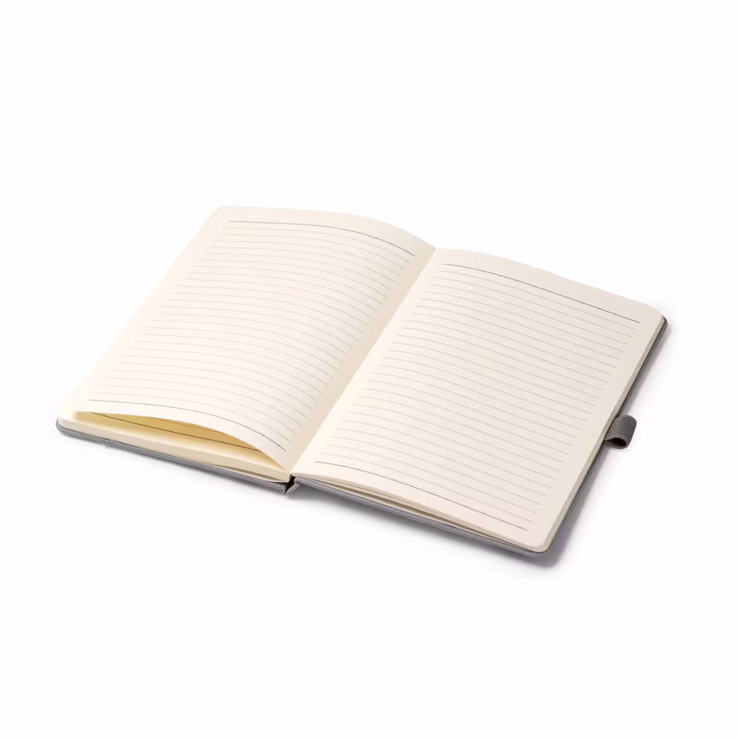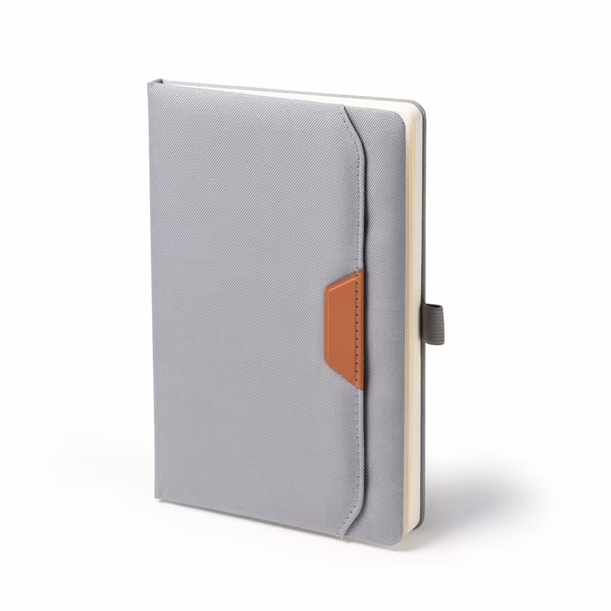 Bloc de notas A5 con tapa rígida de RPET 600D y PU Leather con bolsillo exterior. Incluye soporte para bolígrafo. 80 hojas rayadas de 80 g/m².