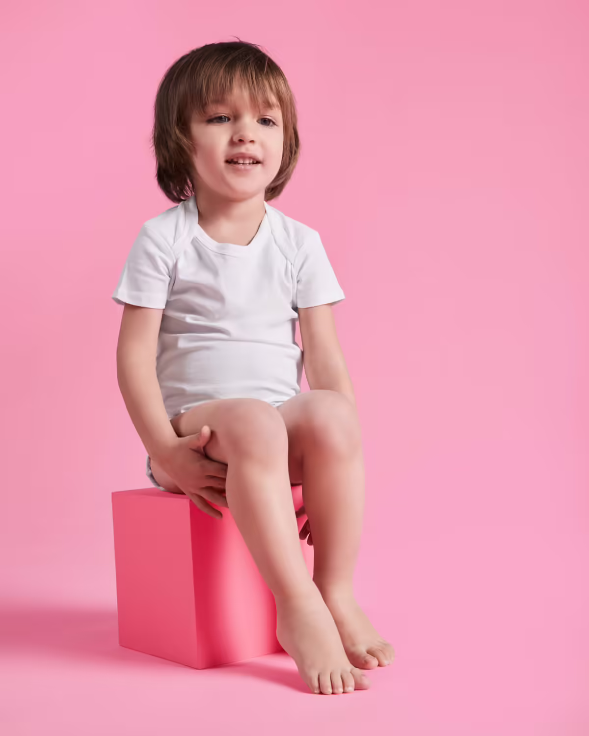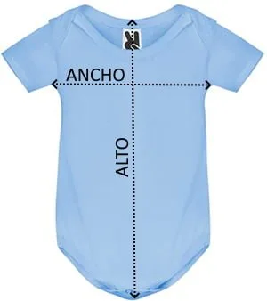 Body de bebé con manga corta de punto liso. Cuello redondo y bajo ribeteado en canalé 1×1. Cierre con botones a presión en la entrepierna. Hombro de apertura cruzada (sisa americana).