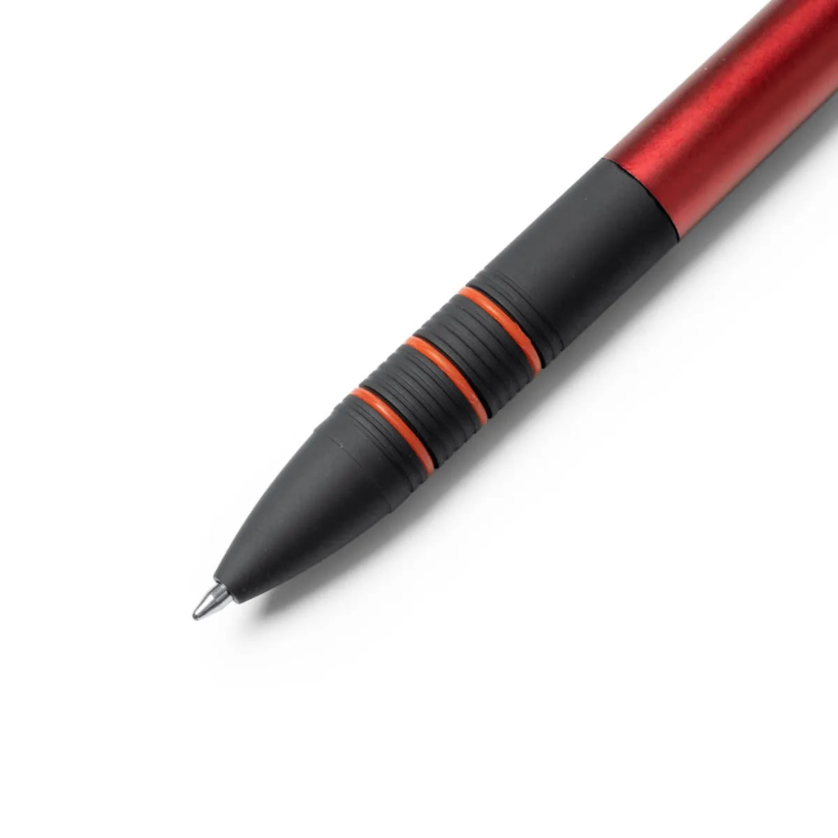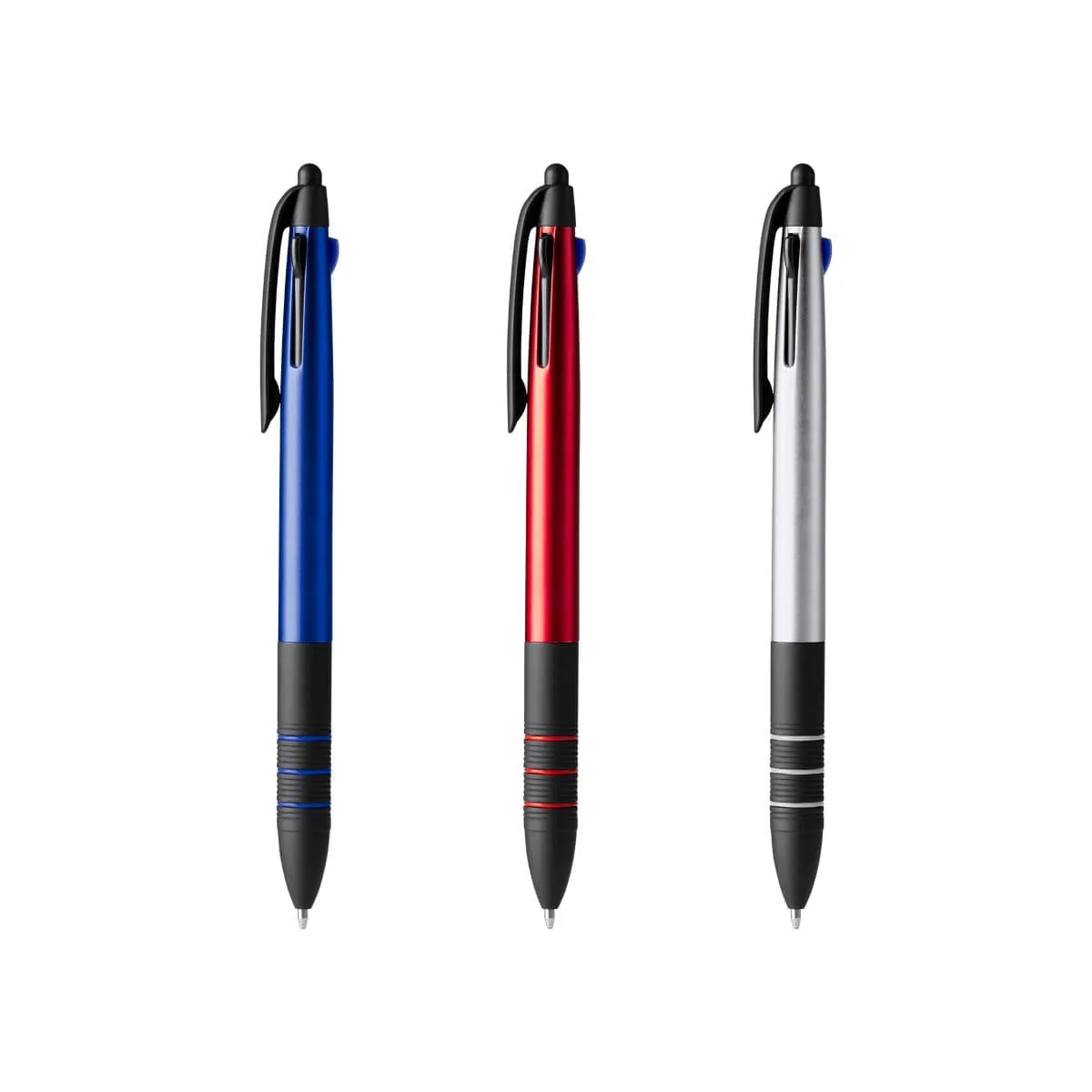 Bolígrafo de 3 tintas con pulsador retráctil. Cuerpo en ABS y detalles en negro con cómoda empuñadura que permite una confortable escritura. Tintas azul, negra y roja.