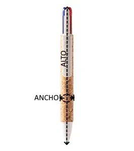 Bolígrafo de 4 tintas con pulsador retráctil. Cuerpo de corcho y fibra de trigo. Tinta azul, rojo, verde y negro.