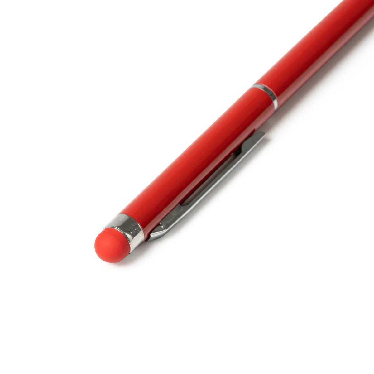 Bolígrafo giratorio de aluminio con puntero táctil en color a juego con el cuerpo. Tinta azul.