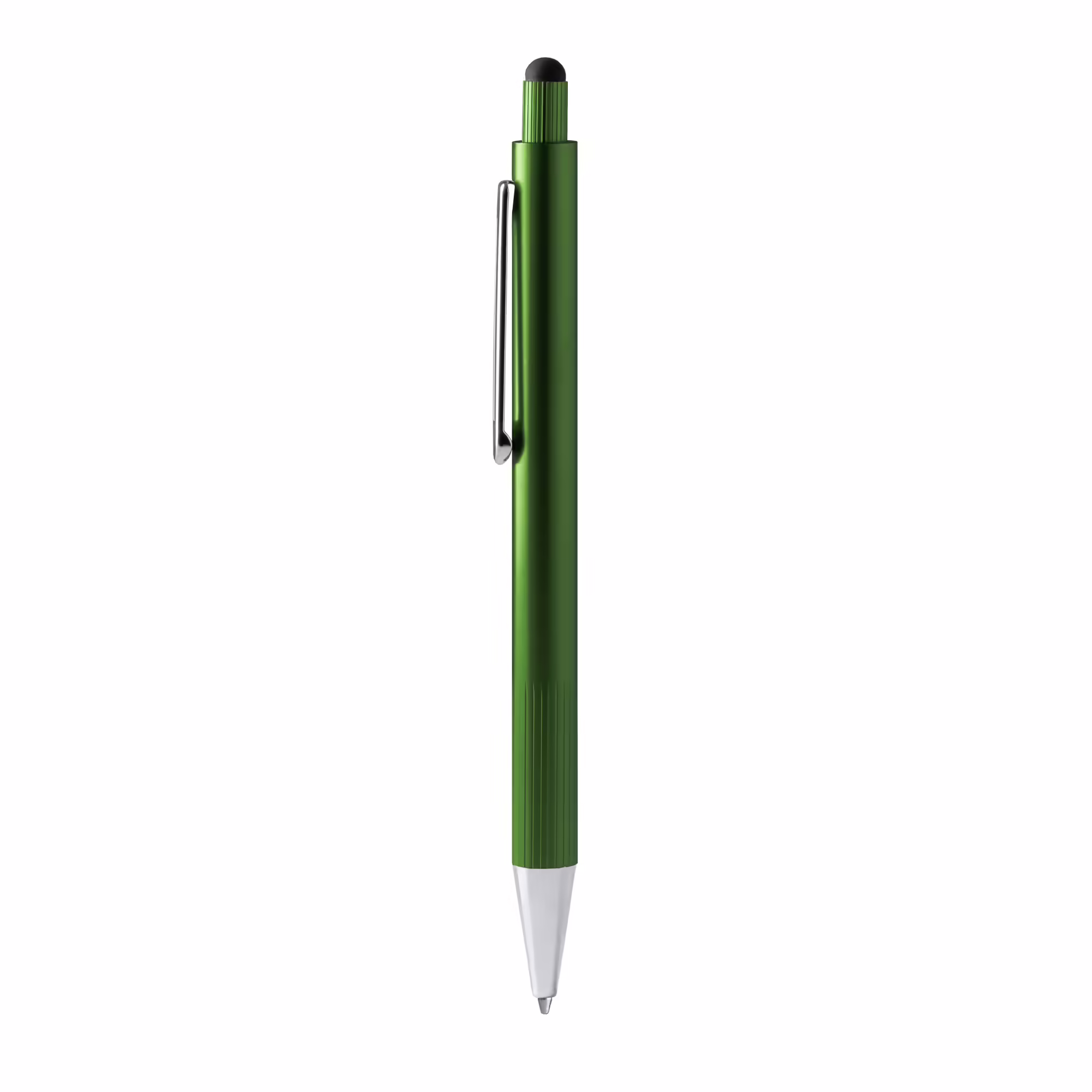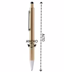 Bolígrafo de aluminio con agarre rayado en acabo metálico y puntero táctil. Carga jumbo de tinta azul.