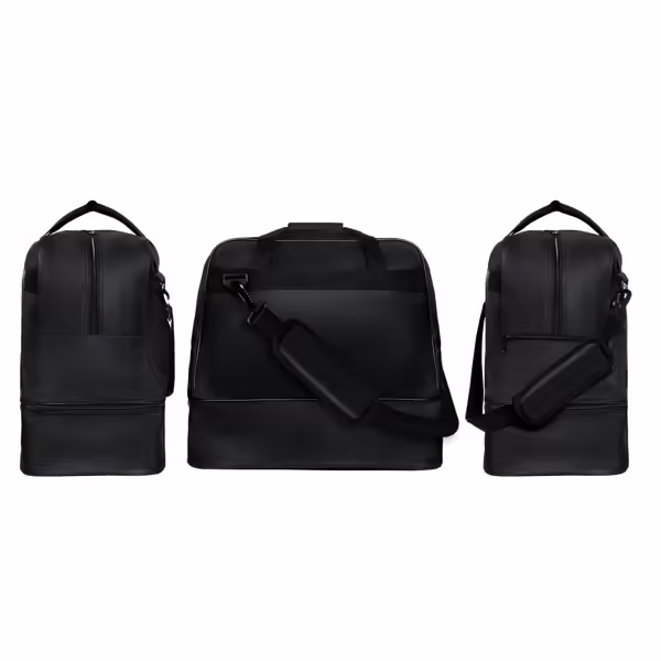 Bolsa deportiva con doble asa y asa larga ajustable para colgar. Bolsillo principal con doble tirador. Bolsillo zapatillero con compartimento extraíble. Anti-humedad. Base con tacos. Fácil limpieza.