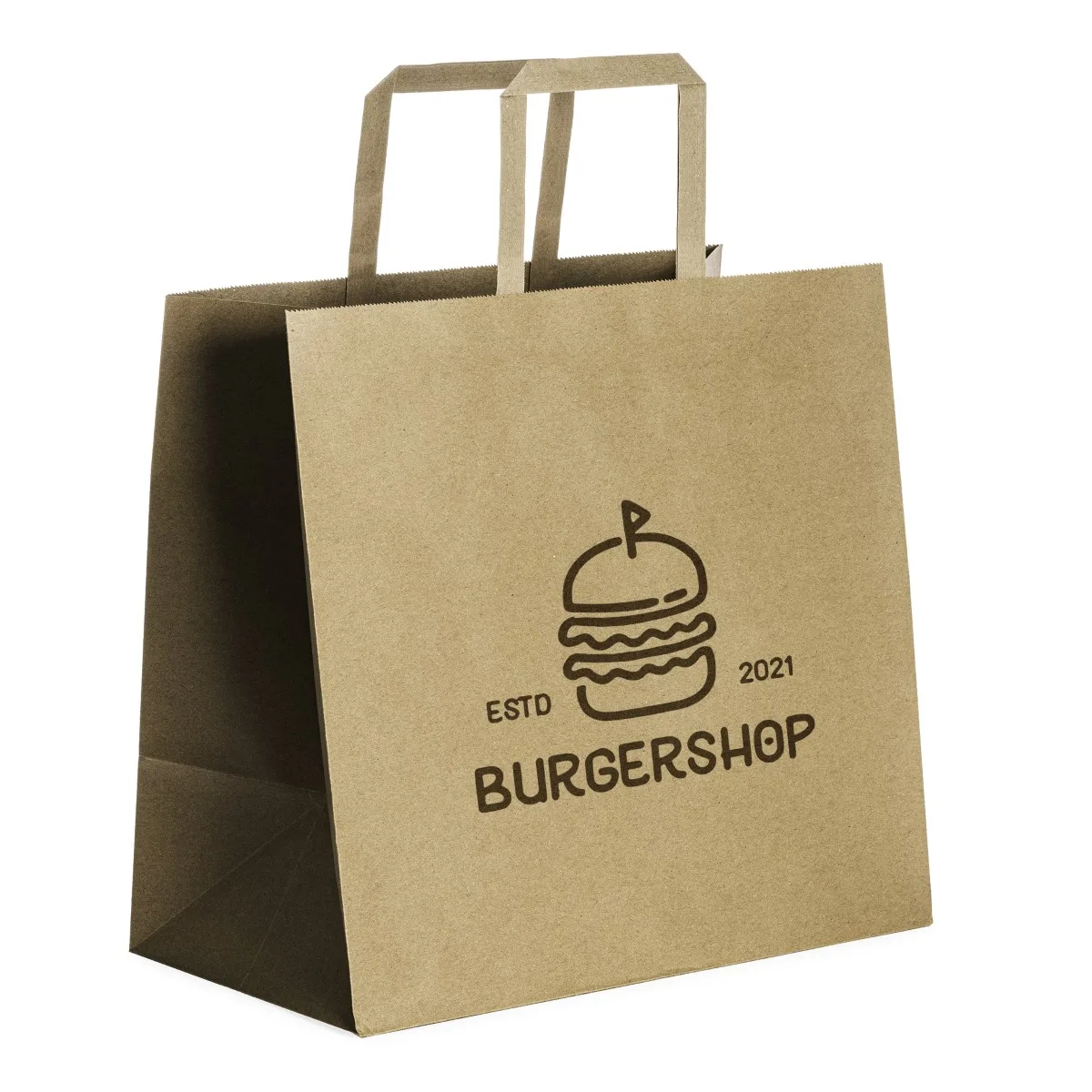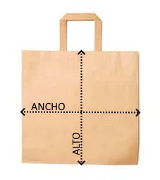 Bolsa de papel de 110 g/m² en acabado natural. Asas cortas reforzadas de diseño plano. Ideal para hostelería y restauración (take away).