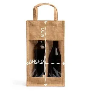 Bolsa de yute laminado con ventana y doble compartimento. Ideal para transportar botellas. Asas reforzadas.