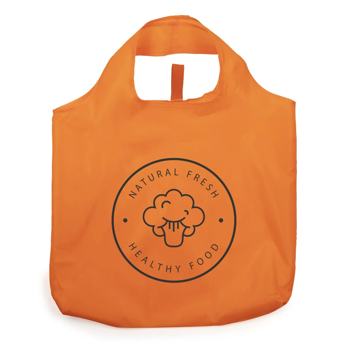 Bolsa de la compra plegable en suave poliéster 190T en acabado cosido. Incluye práctico elástico para plegado.