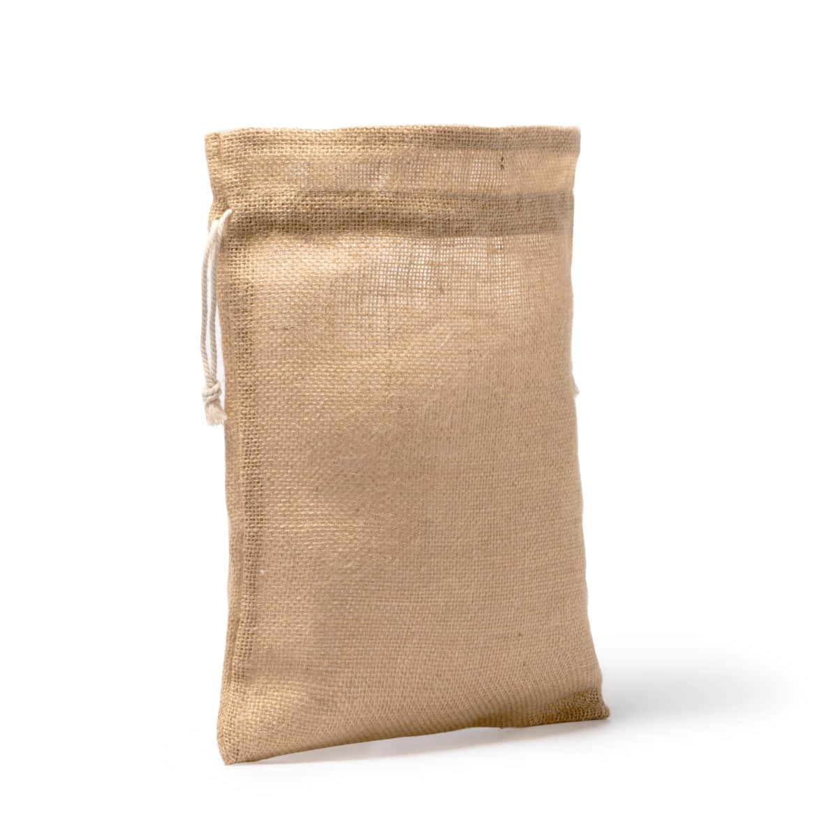 Bolsa estilo saco de yute natural. Cierre con cordones de algodón.