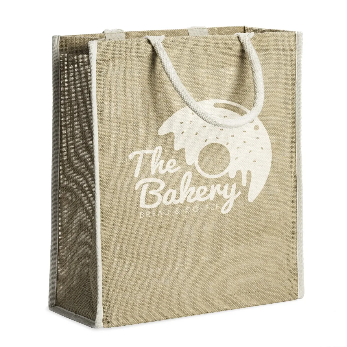 Bolsa de yute natural con ribetes y asas reforzadas de algodón. Acabado cosido