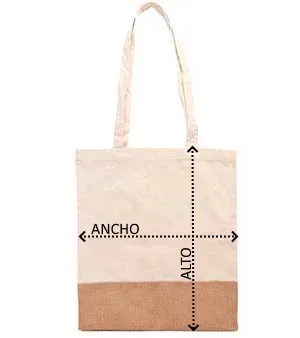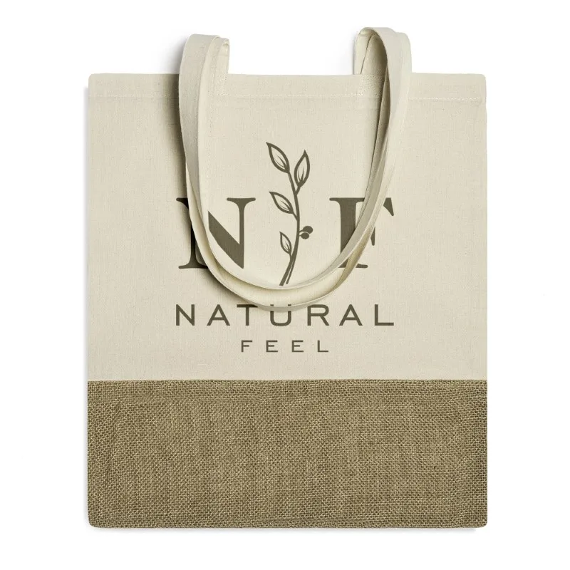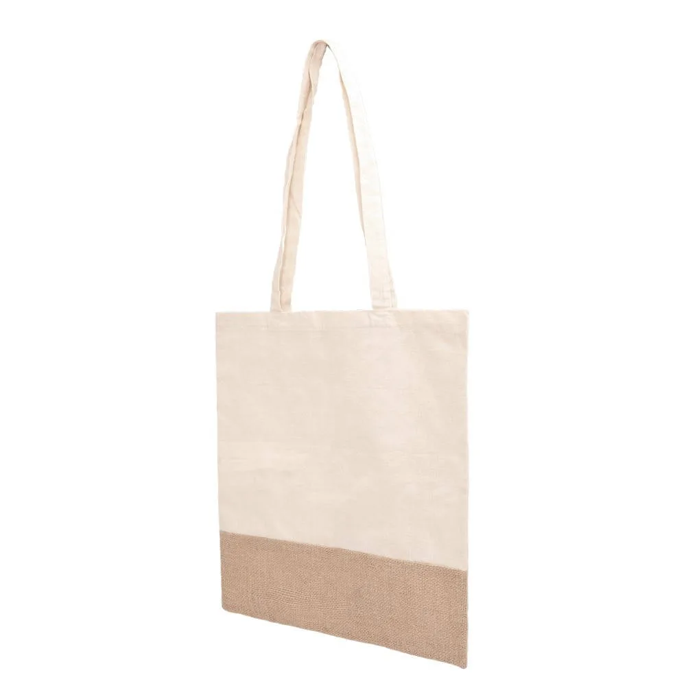 Bolsa de la compra línea eco de algodón de 120 g/m2 y yute. Color natural. Un lado de la bolsa presenta una banda de yute en la parte inferior. Asas largas de 70 cm.