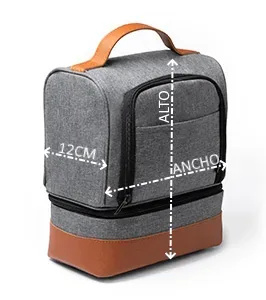 Nevera de políester reciclado RPET con diseño vigoré. Doble compartimento independientes con cierre de cremalleras y con interior isotérmico. Asas de transporte y base en PU Leather.