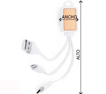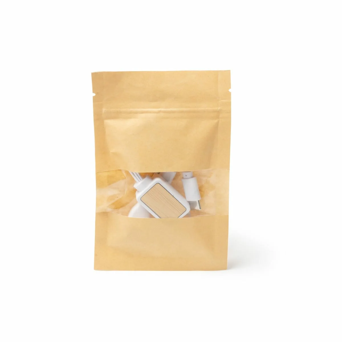 Cable cargador 3 en 1 línea Eco. Cuerpo rectangular en bambú (2,7 x 1,6cm). Conexión Tipo C, USB y Dual (Micro USB y iPhone). Presentación en bolsa de papel marrón con ventana.