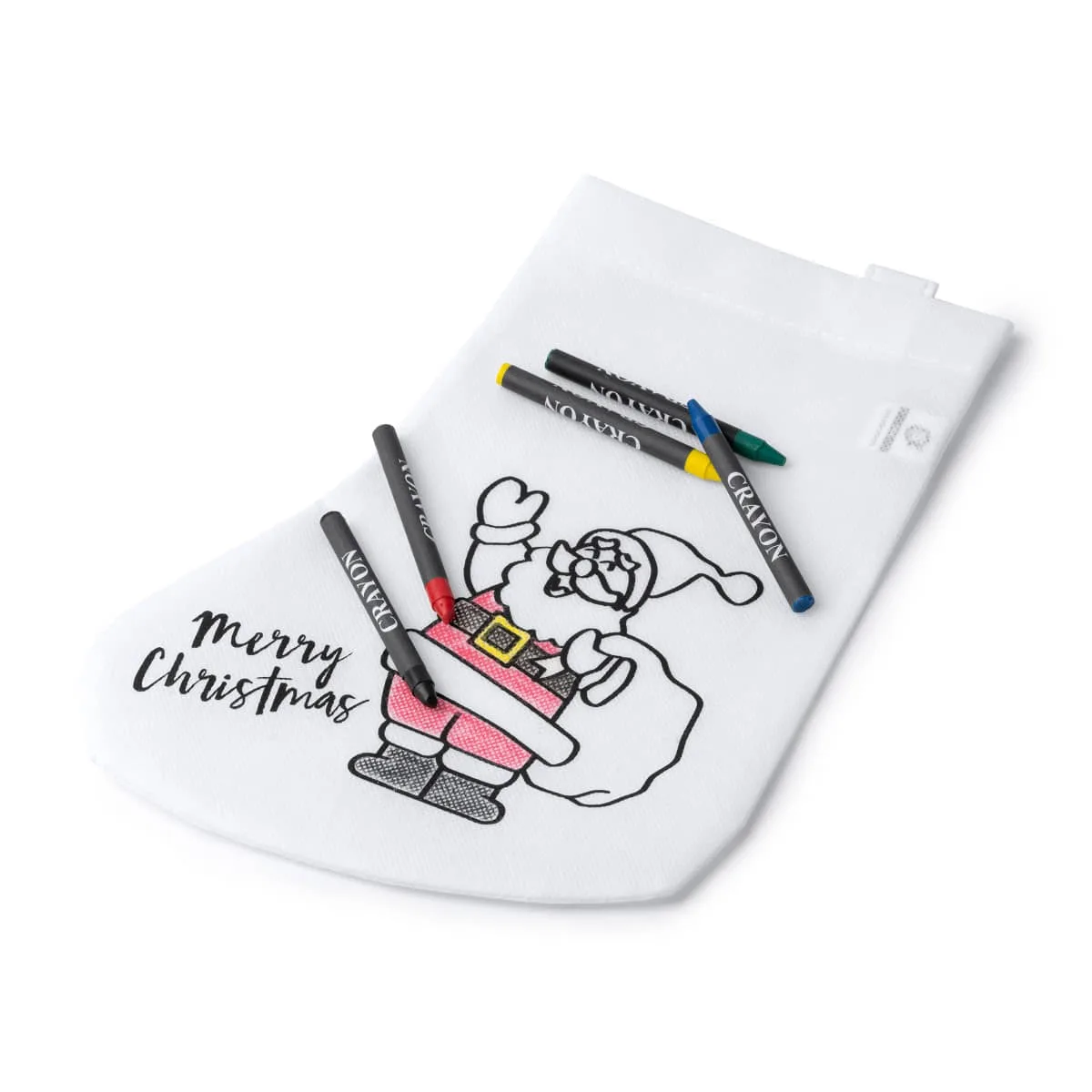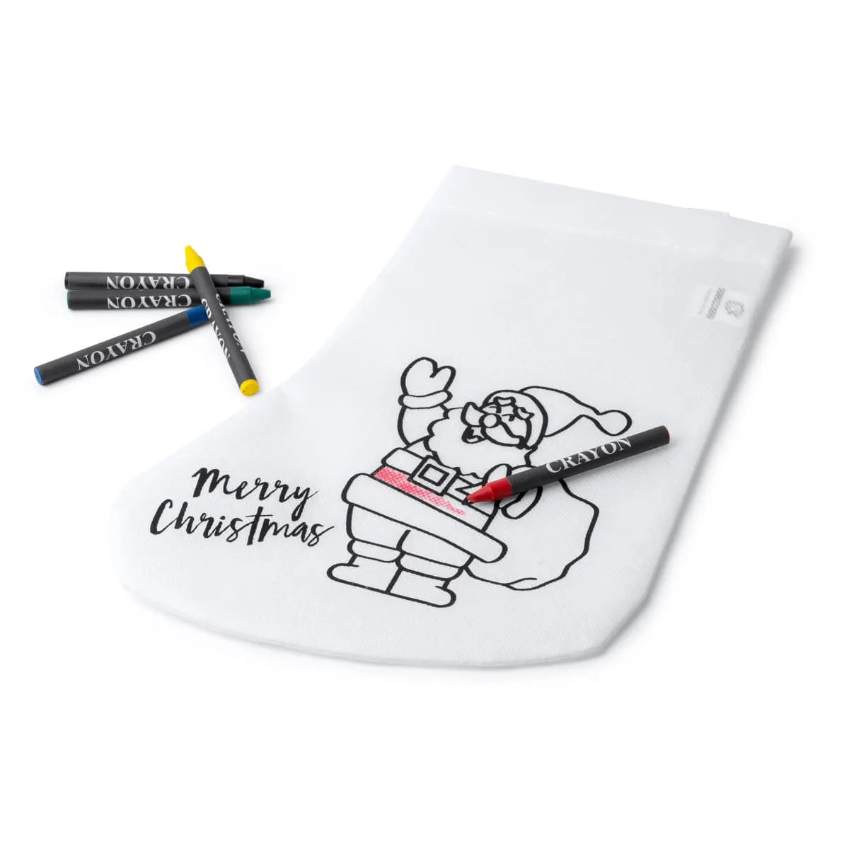 Calcetín con divertido diseño navideño para colorear. Incluye 5 ceras de colores: azul, rojo, negro, amarillo y verde.