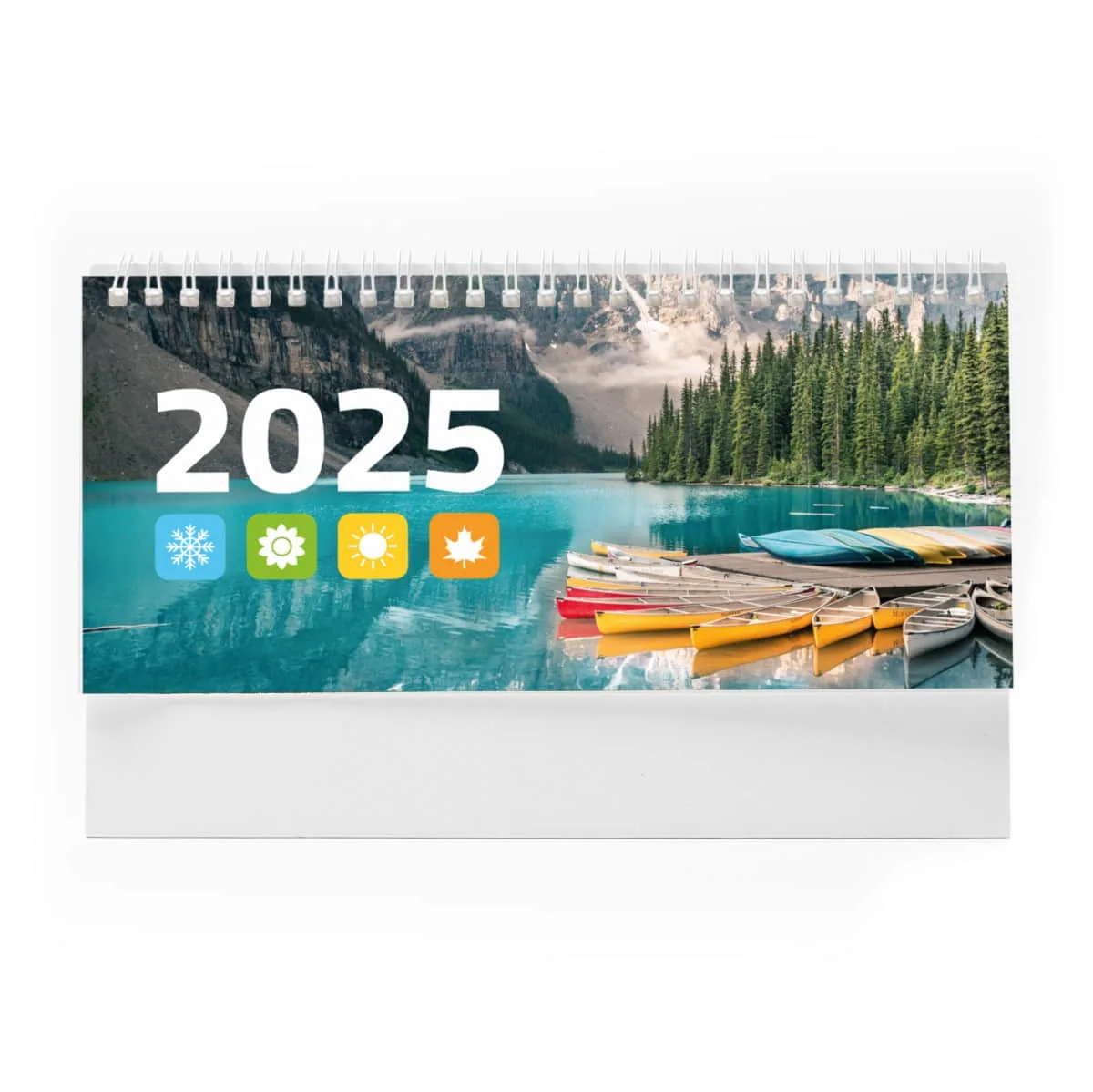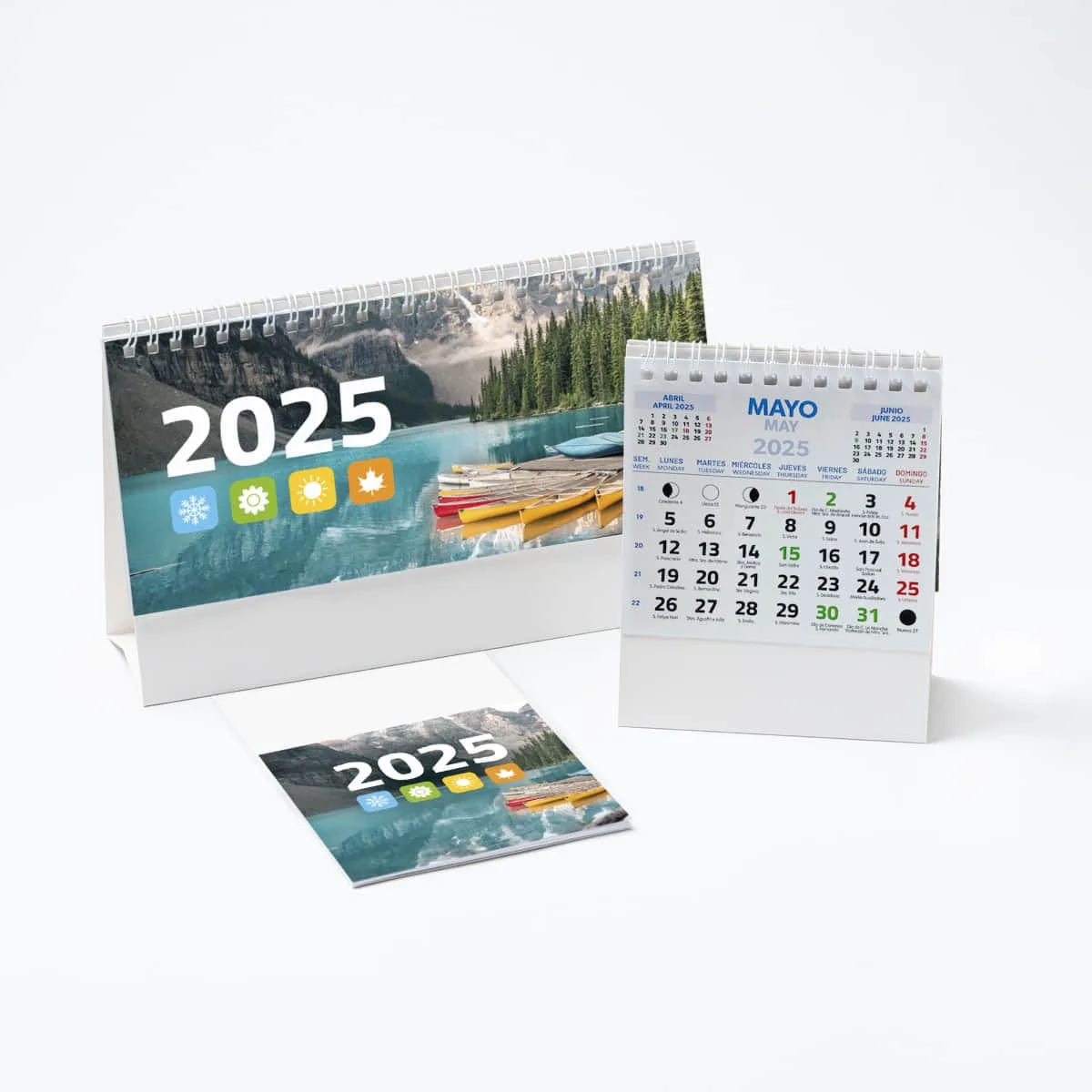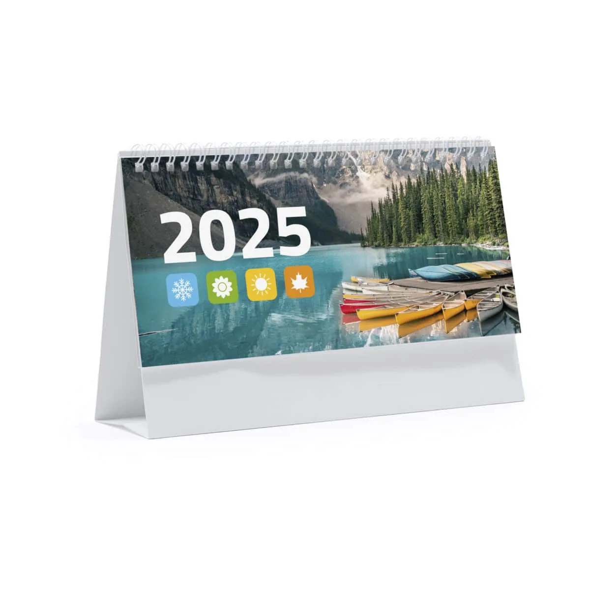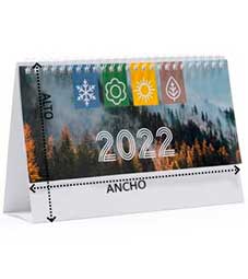 Calendario de sobremesa horizontal con anillas. Diseño mes en curso / mes anterior / mes siguiente / Calendario anual. Incluye santoral. Cuerpo de cartón ideal para marcar.