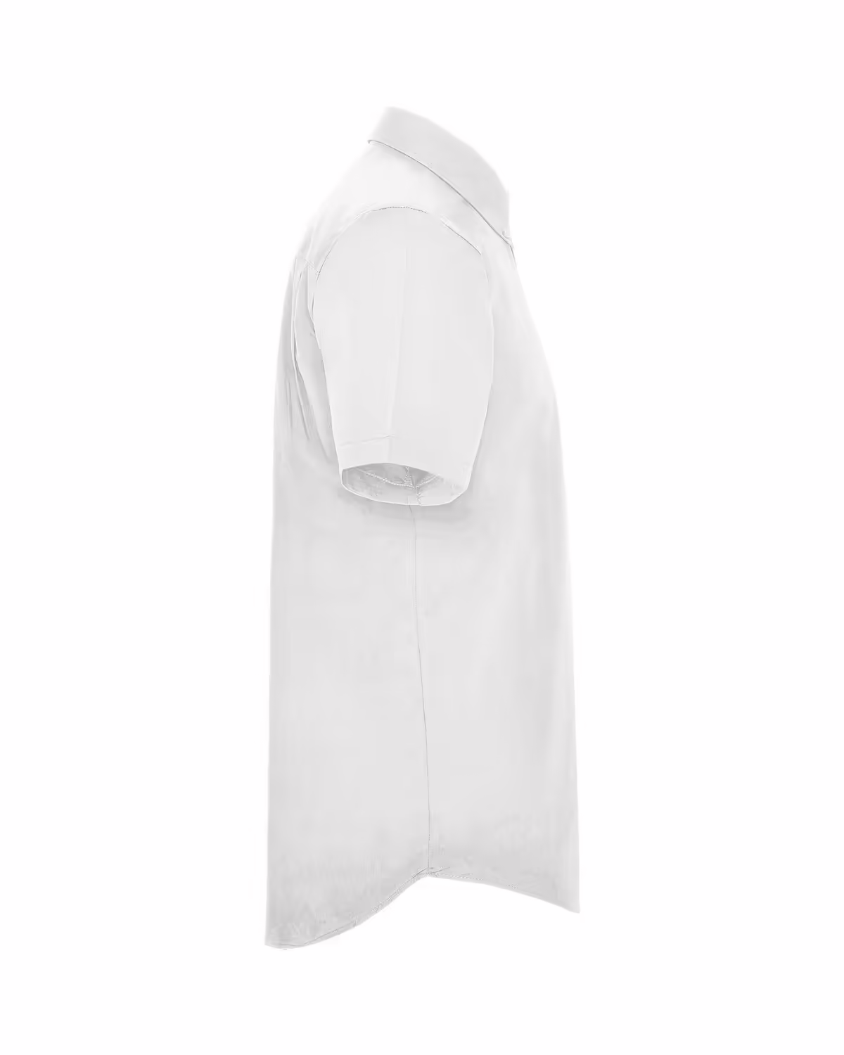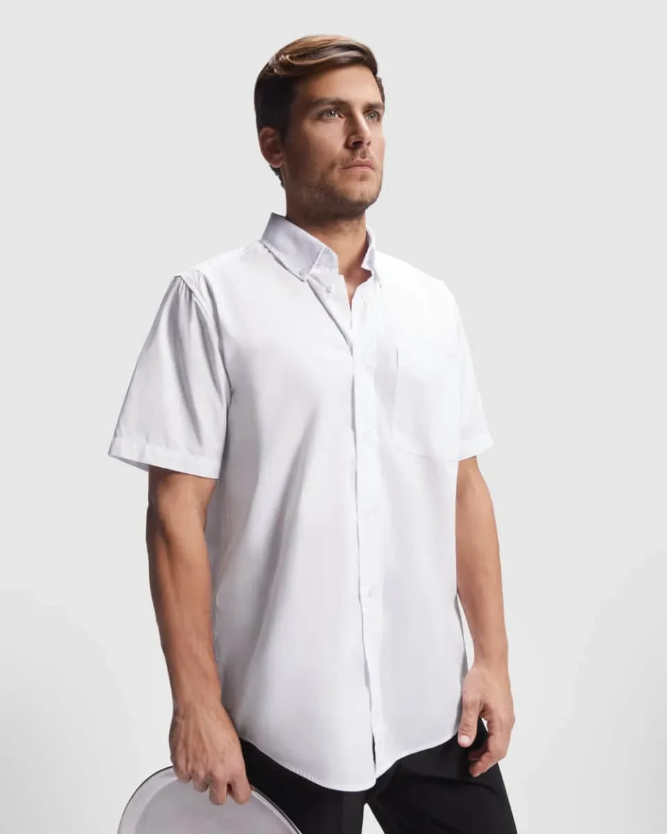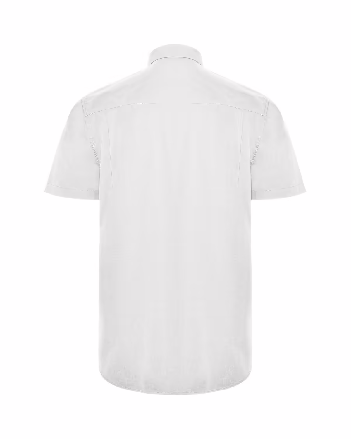 NUEVAS PRODUCCIONES SIN BOTONES EN EL CUELLO – Camisa de manga corta y cuello clásico almidonado de 1 botón. Bolsillo frontal izquierdo, tapeta con 7 botones a tono y bajo con forma. Cuidado fácil.