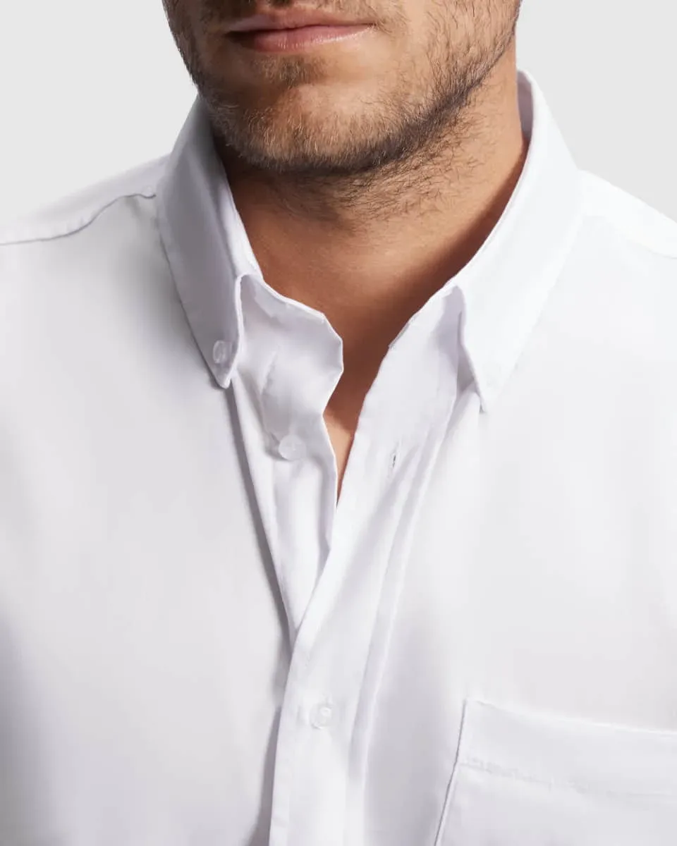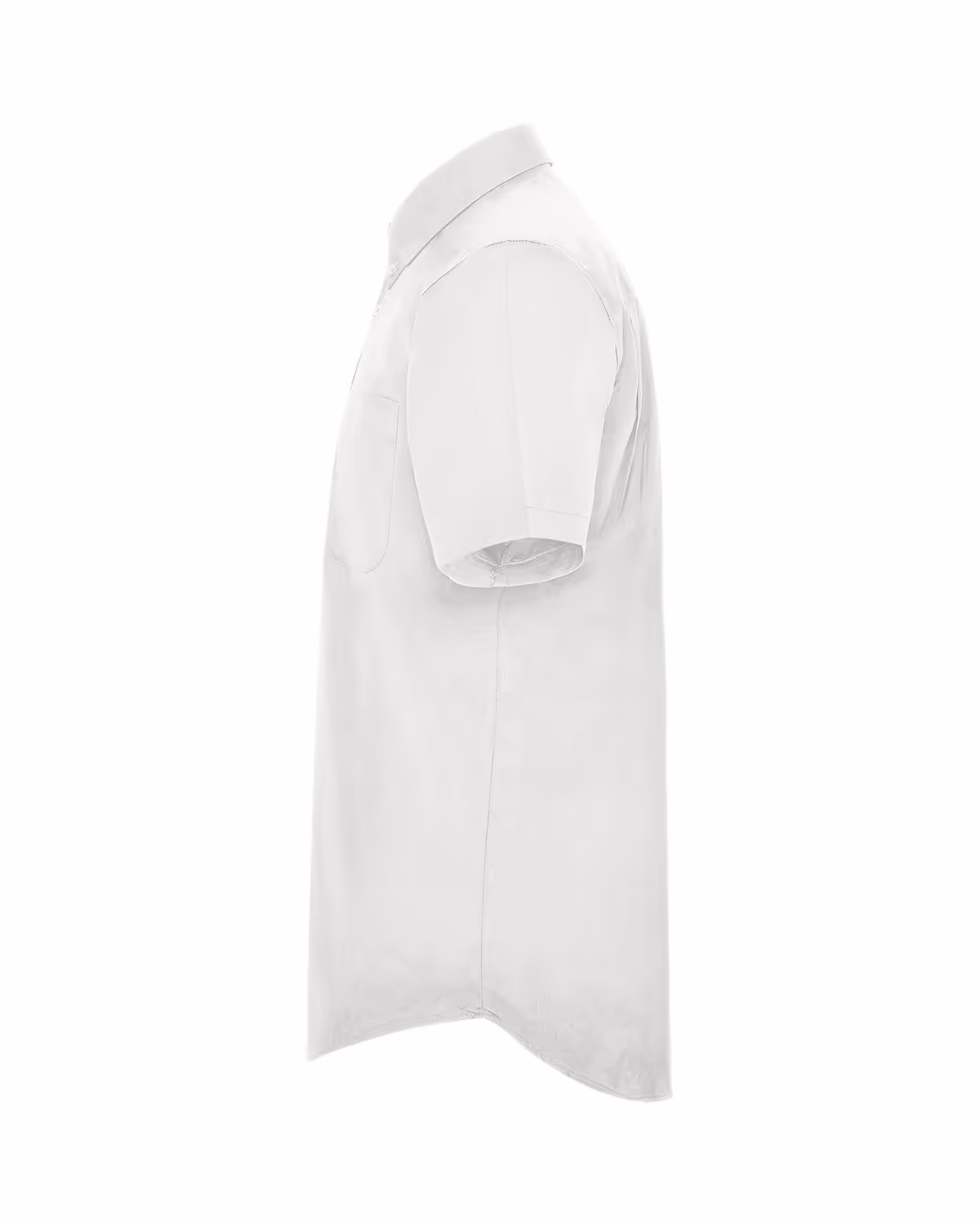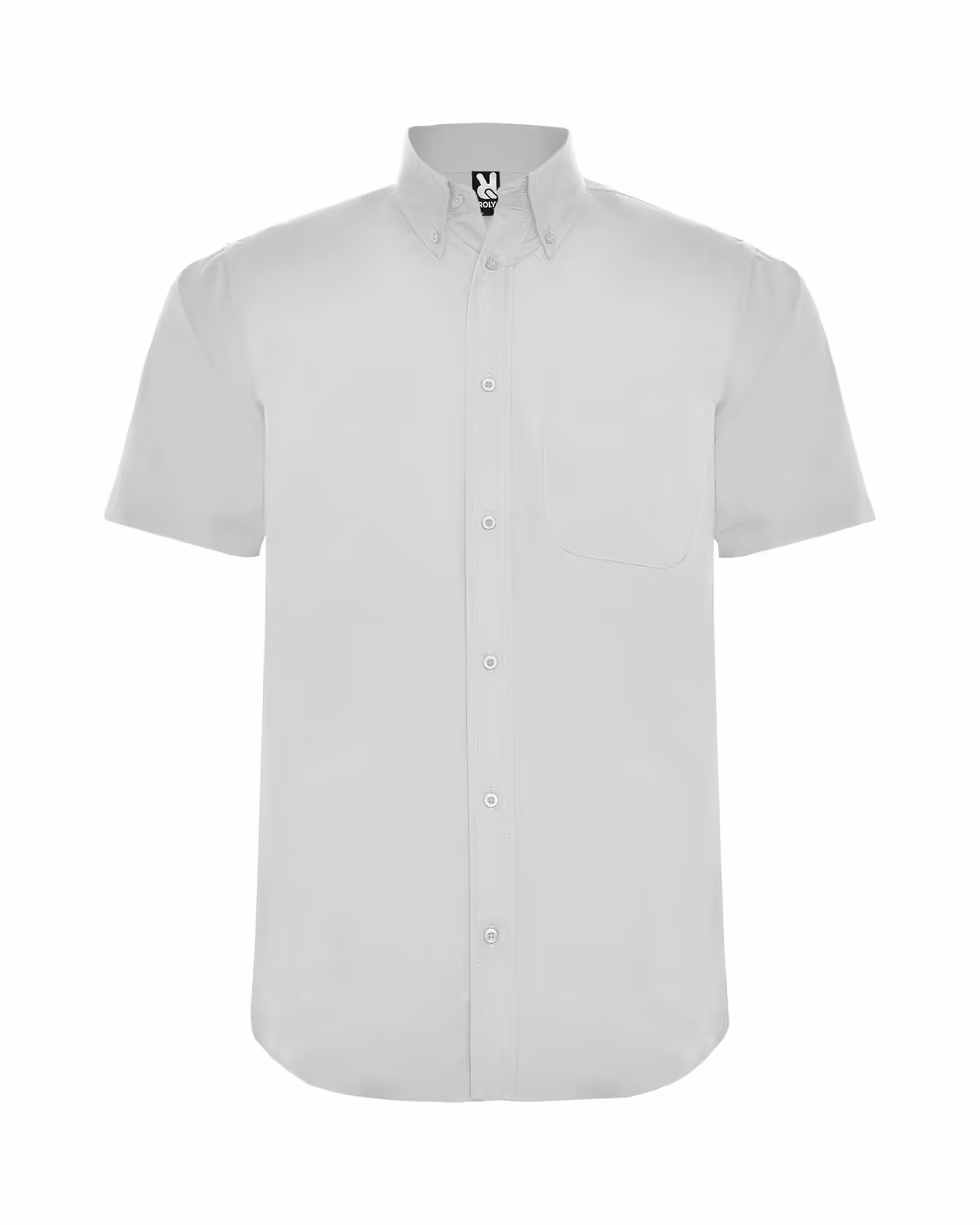NUEVAS PRODUCCIONES SIN BOTONES EN EL CUELLO – Camisa de manga corta y cuello clásico almidonado de 1 botón. Bolsillo frontal izquierdo, tapeta con 7 botones a tono y bajo con forma. Cuidado fácil.