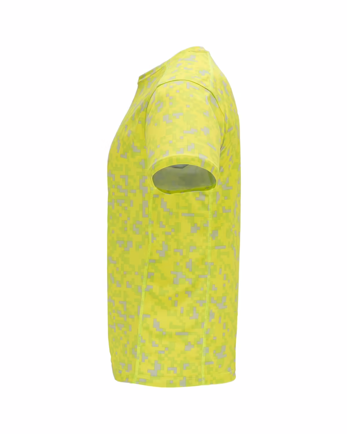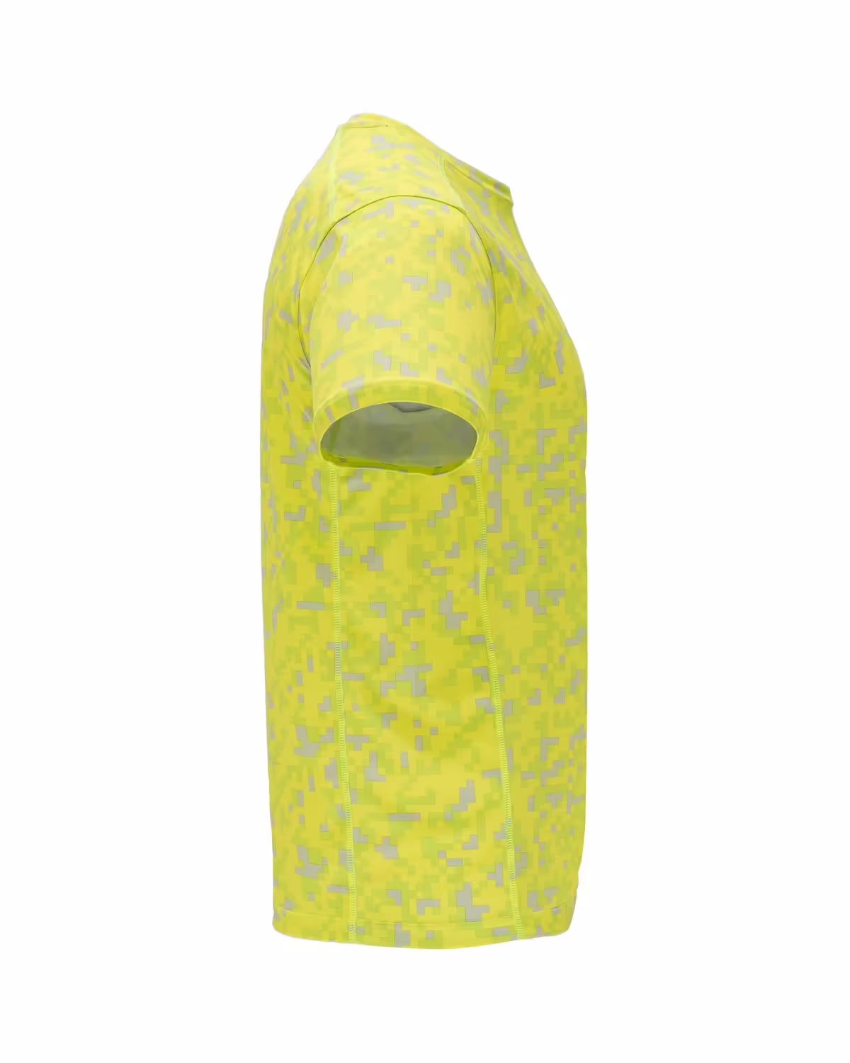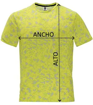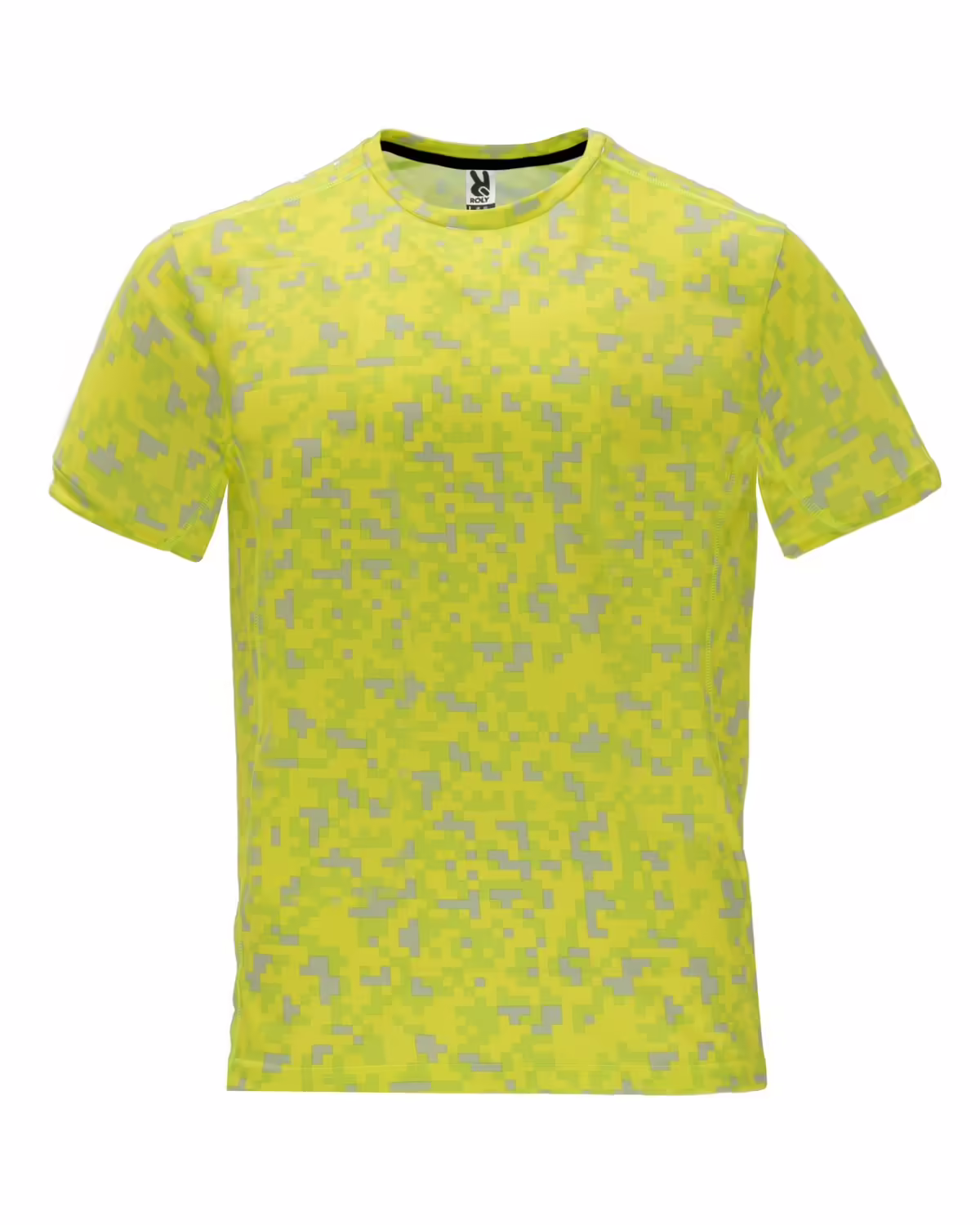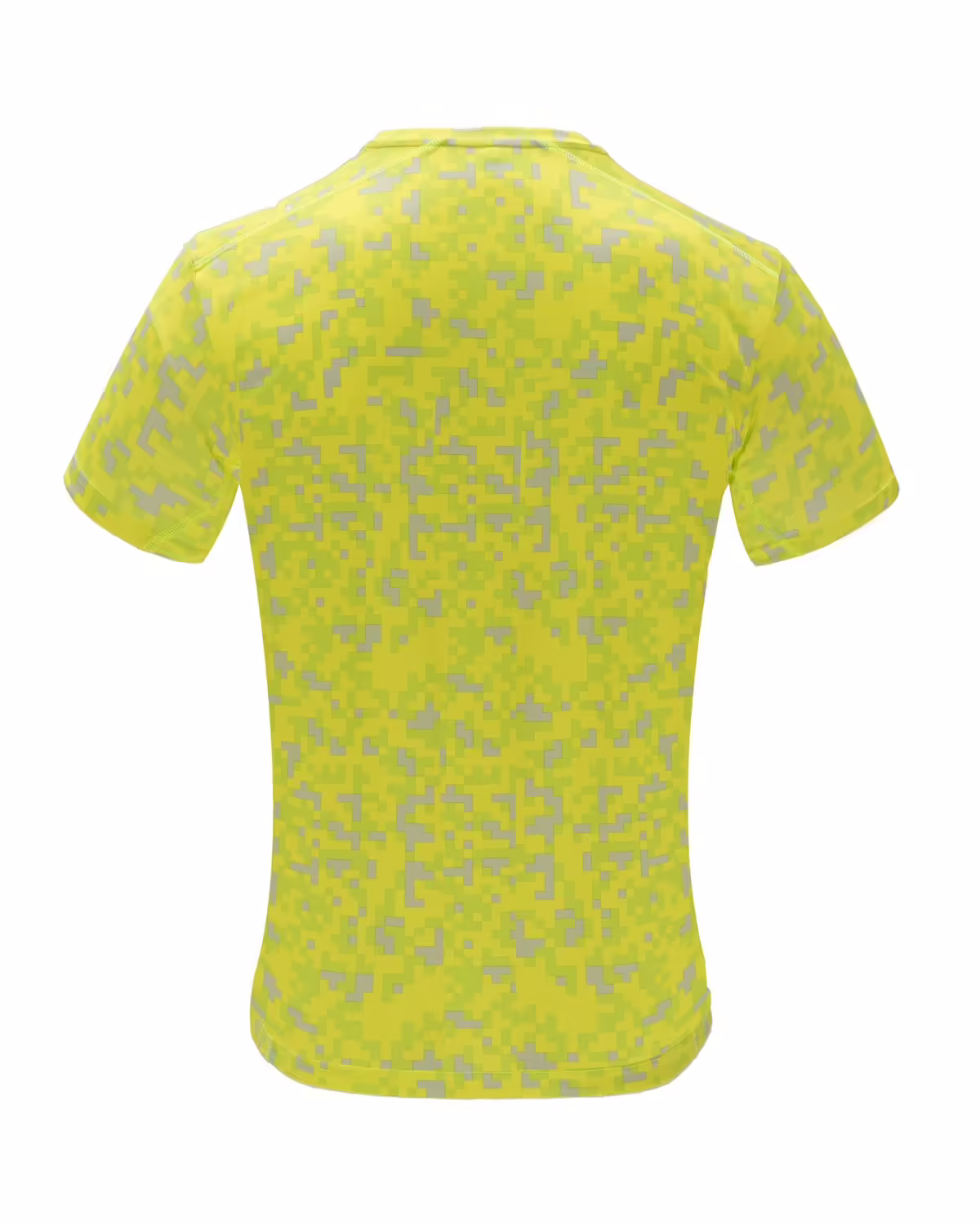 Camiseta técnica estampada de manga corta. Cuello redondo con cubrecosturas de refuerzo a contraste en color amarillo flúor. Paneles laterales en interior de manga y en los hombros con remallado a tono.