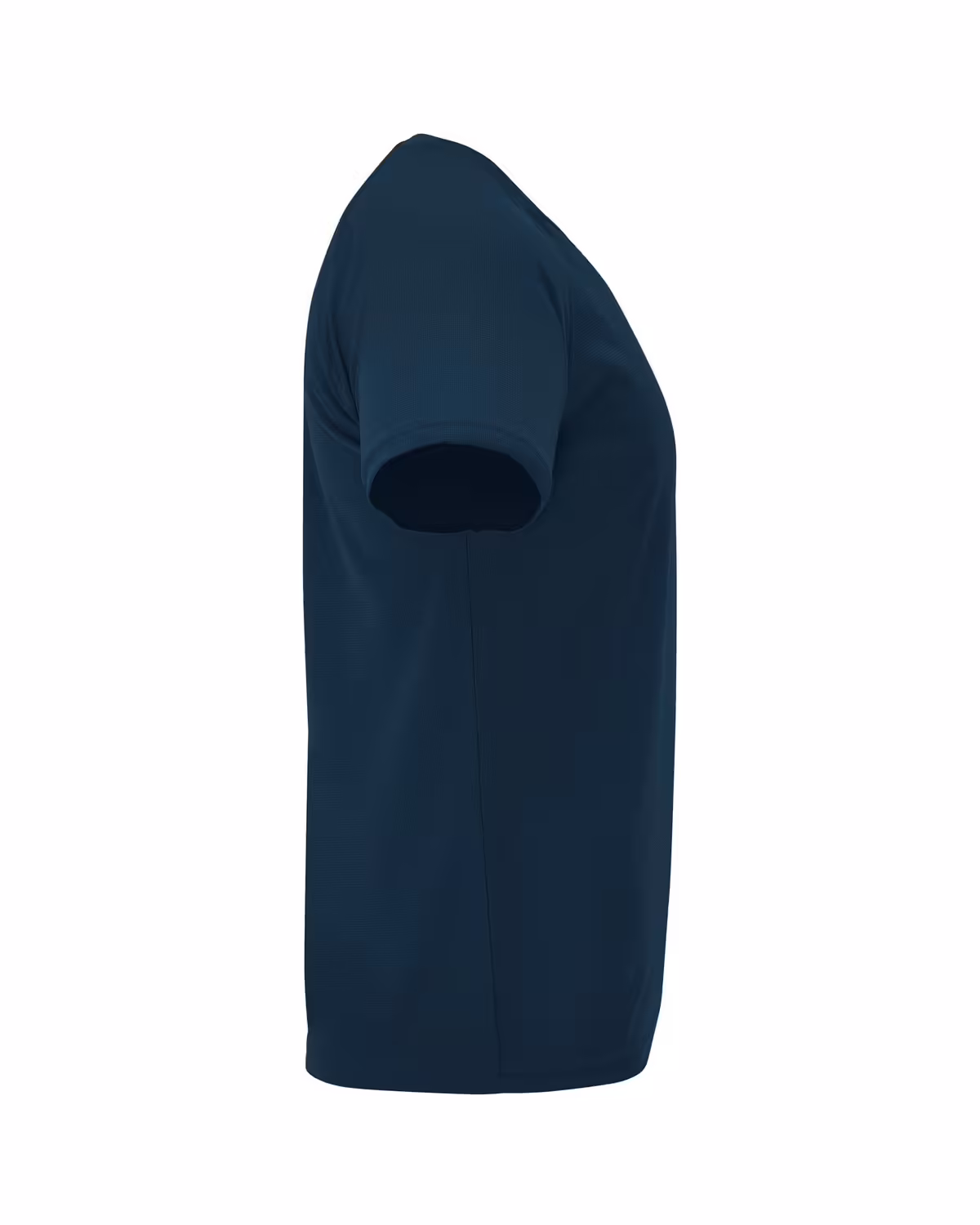 Camiseta técnica de manga corta ranglán. 1. Cuello redondo con cubrecosturas a tono. 2. Paneles inferiores en mangas. 3. Remallado a tono en sisa y panel de manga. 4. Tejido CONTROL DRY.