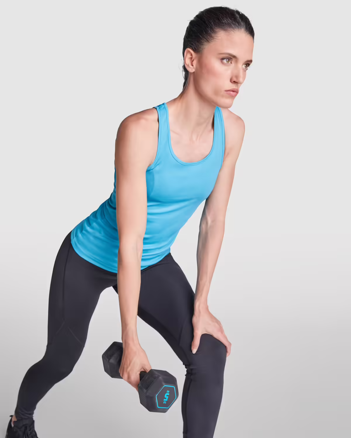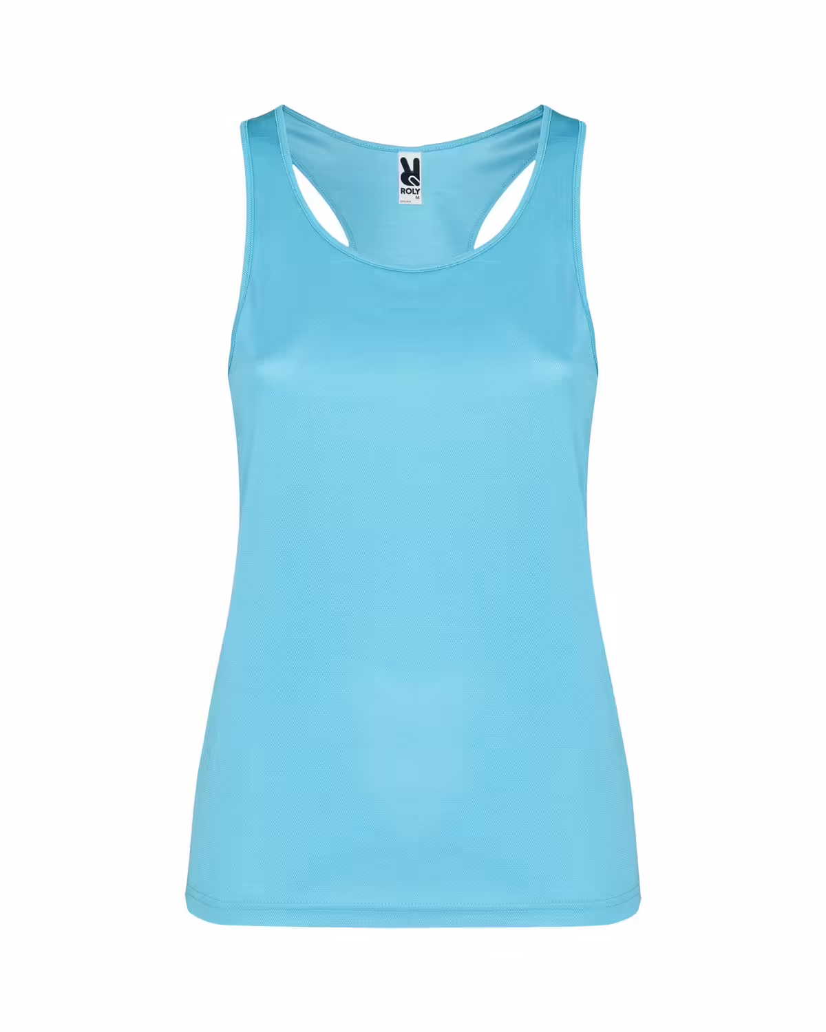 Efectivamente, la camiseta deportiva con sisa y escote ribeteado para mujer Shura de la casa Roly es como un lienzo vacío esperando que le des tu toque personal.