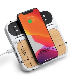 El cargador inalámbrico realizado en bambú y ABS es una opción elegante y sostenible para cargar tus dispositivos de forma conveniente. Este cargador combina la belleza natural del bambú con la resistencia del ABS reciclado, ofreciendo una solución ecoamigable.
