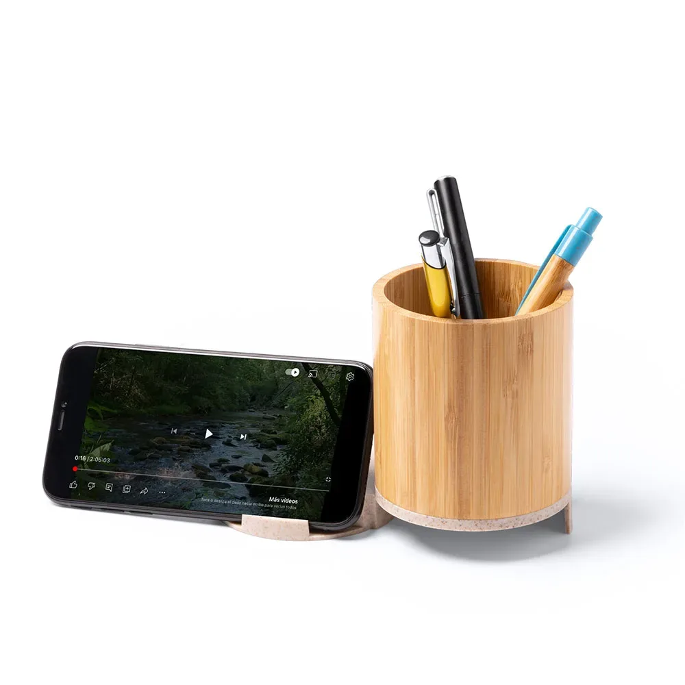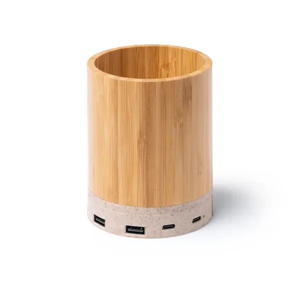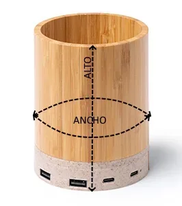Lapicero con cuerpo de bambú y base con funcíon de cagador inalámbrico realizado en fibra de trigo. Salida de potencia 15W. Incluye puerto USB en la base con salida 2 Tipo C y 2 salidas USB.