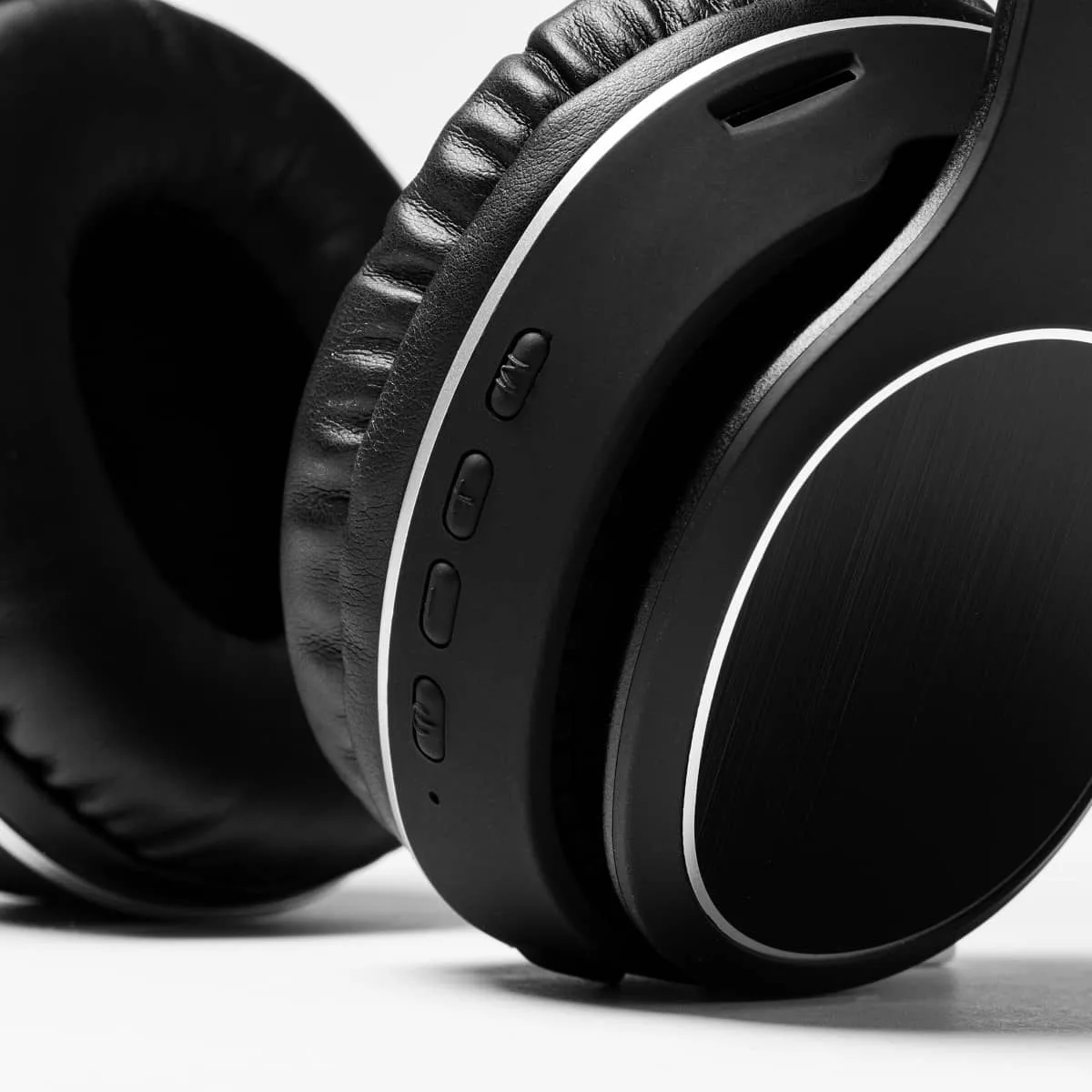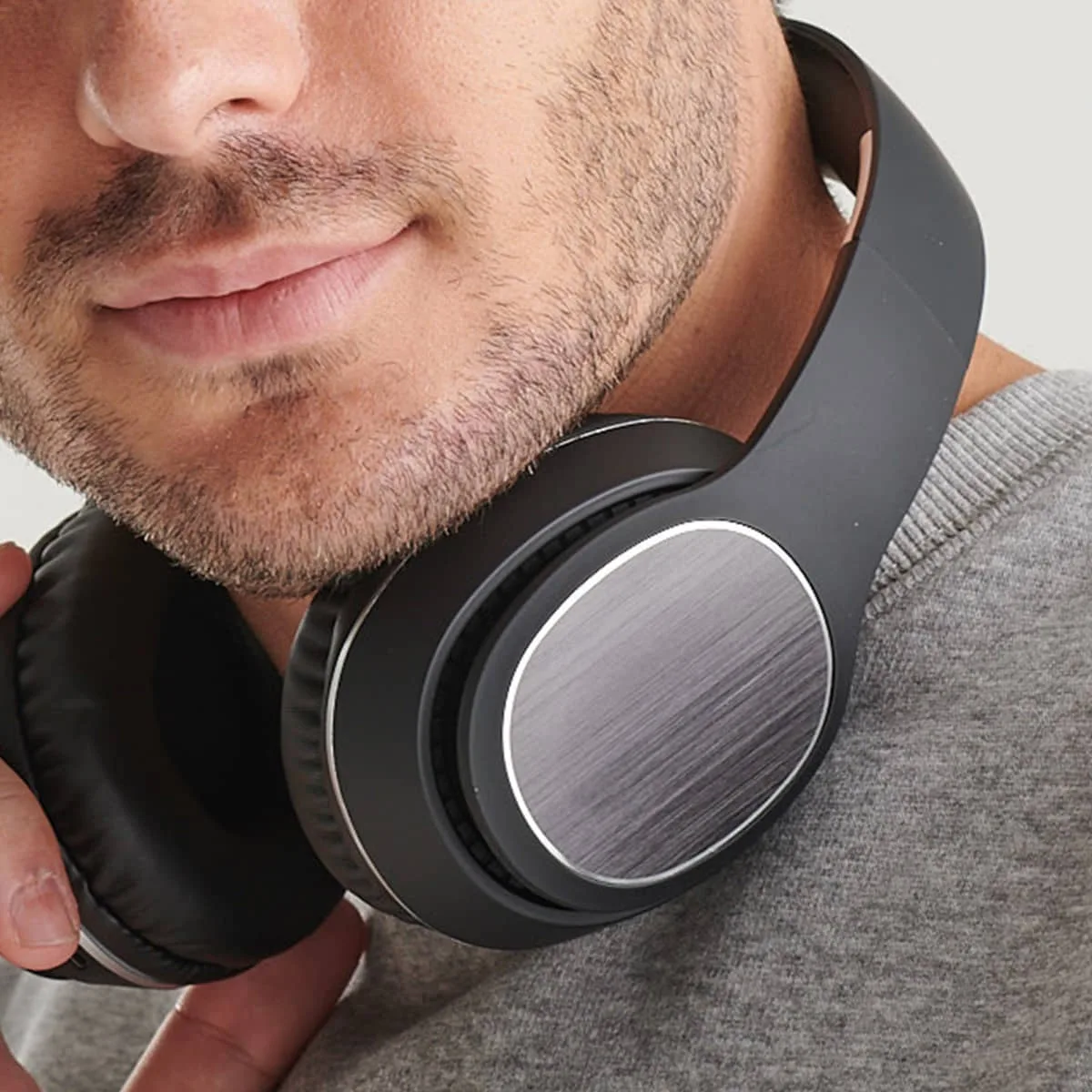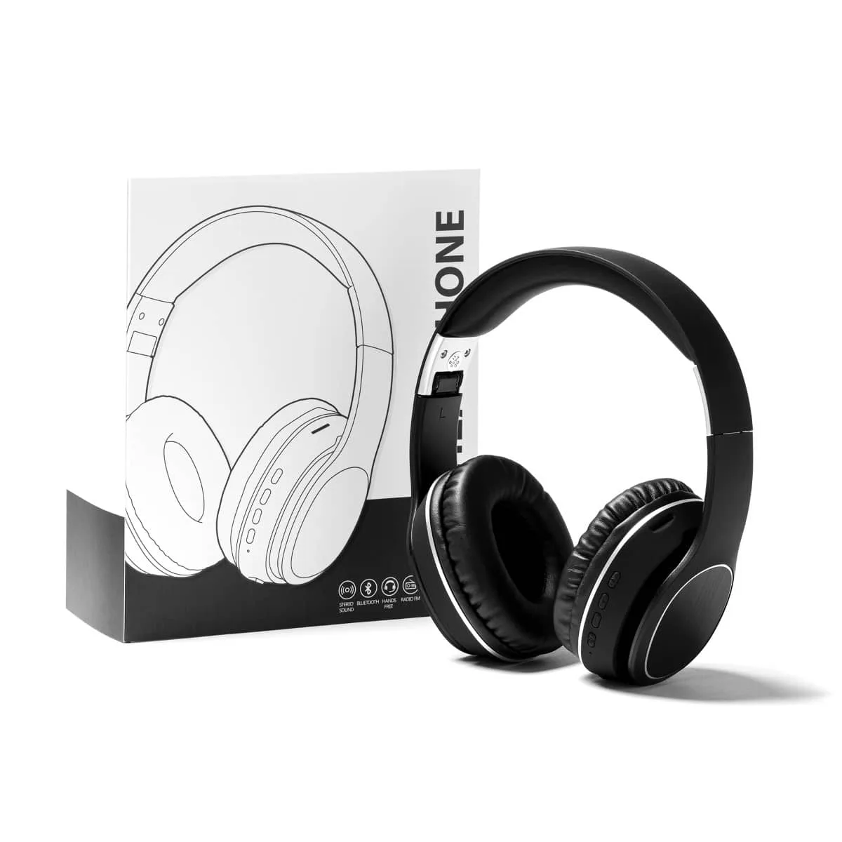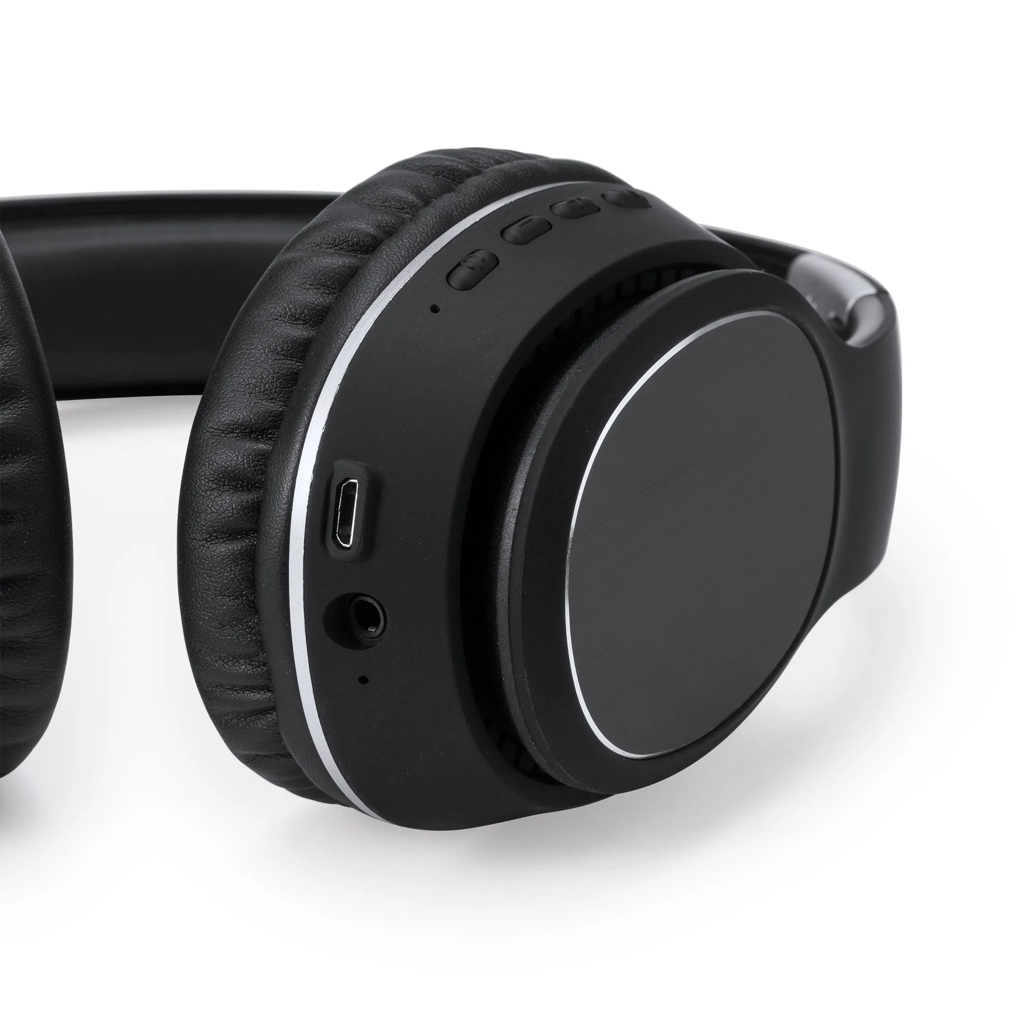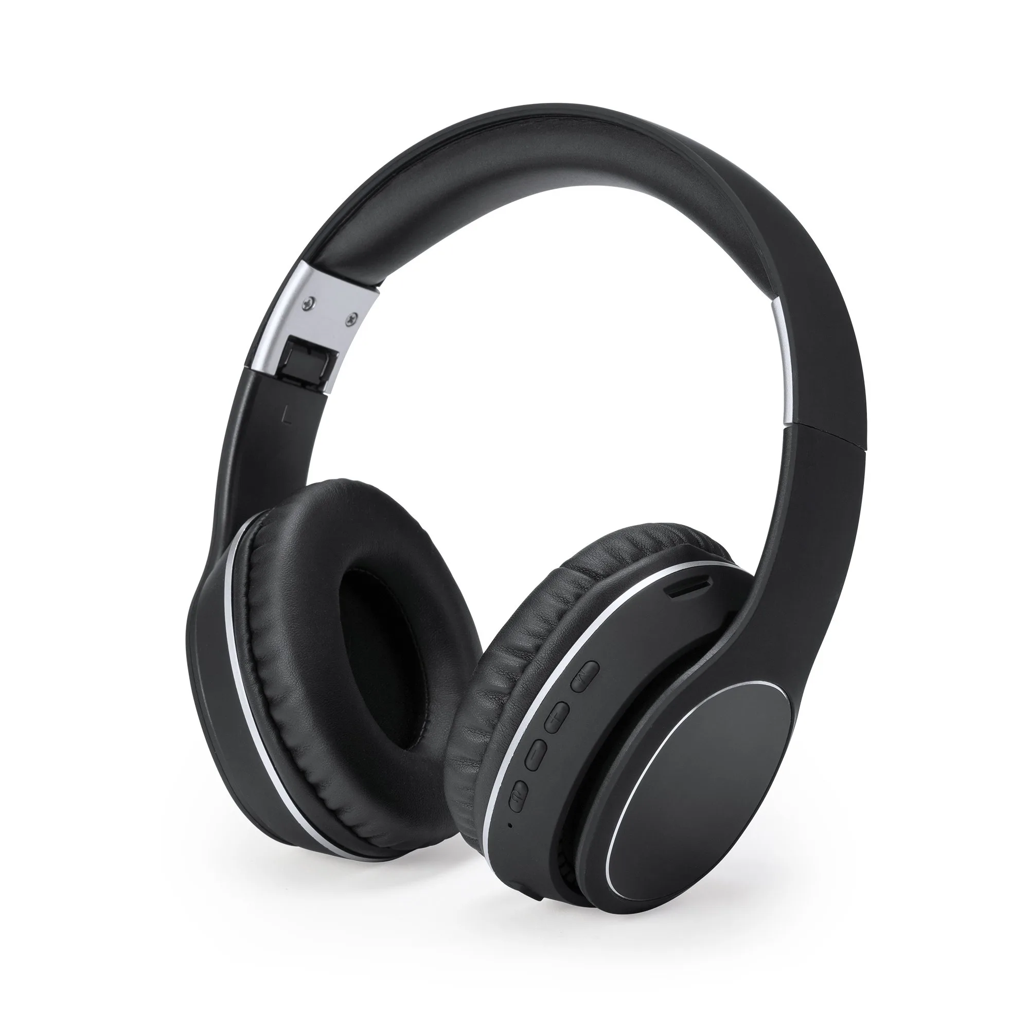 Auriculares inalámbricos Bluetooth 5.0 con acabado tacto goma. Plegables. Acolchado superior y almohadillas en suave polipiel. Laterales en aluminio ideales para marcaje en láser. Panel de control integrado con tecnología estéreo. Función manos libres y radio FM. Batería recargable. Cable incluido. Presentación en caja con fajín de diseño.