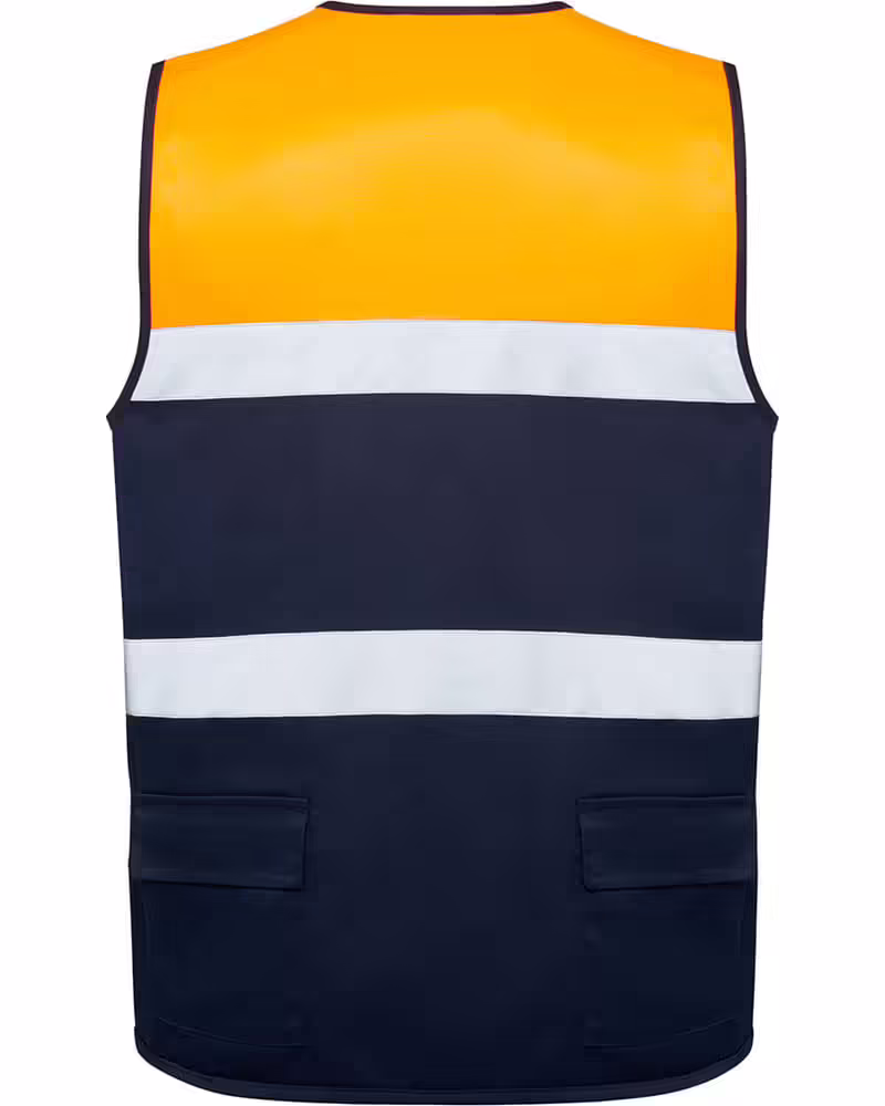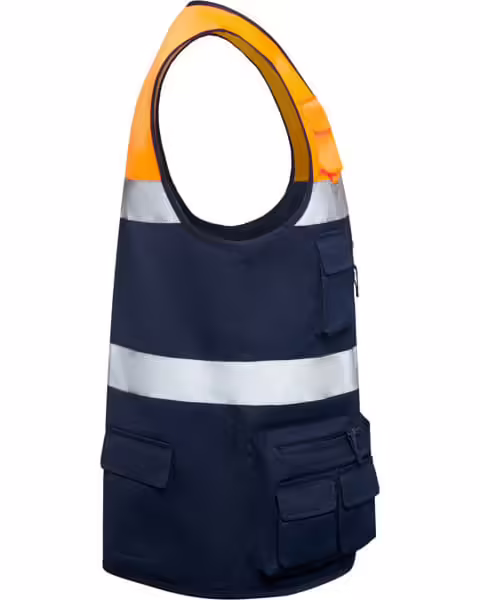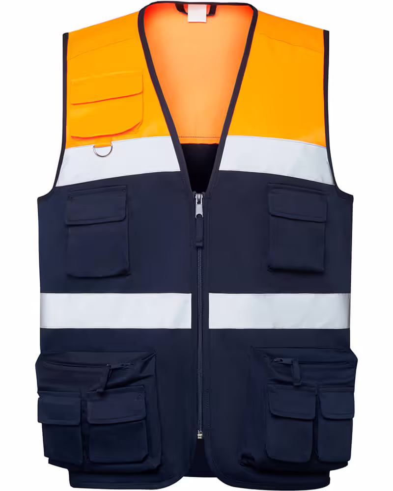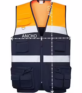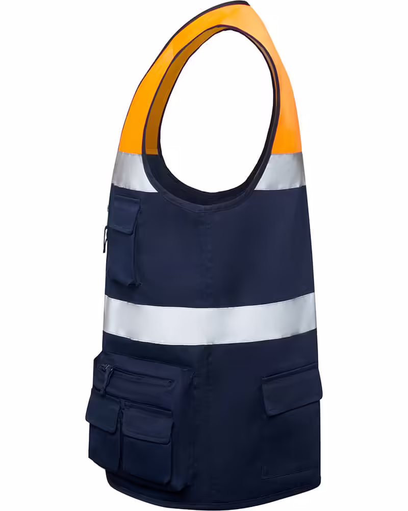 Chaleco multibolsillos de alta visibisidad.· Dos cintas reflectantes en pecho.· Escote en forma de pico y cremallera de Nylon.· Bolsillo superior en pecho derecho, con argolla metálica. · Dos bolsillos en pecho con fuelle, tapeta y cierre de velcro. · Dos bolsillos laterales con fuelle y cierre de cremallera con dos bolsillos superpuestos con tapeta y cierre de velcro. · Dos cintas reflectantes traseras en cintura y espalda. · Dos bolsillos en la parte trasera con tapeta y velcro.· Modelo Ribeteado con bies.