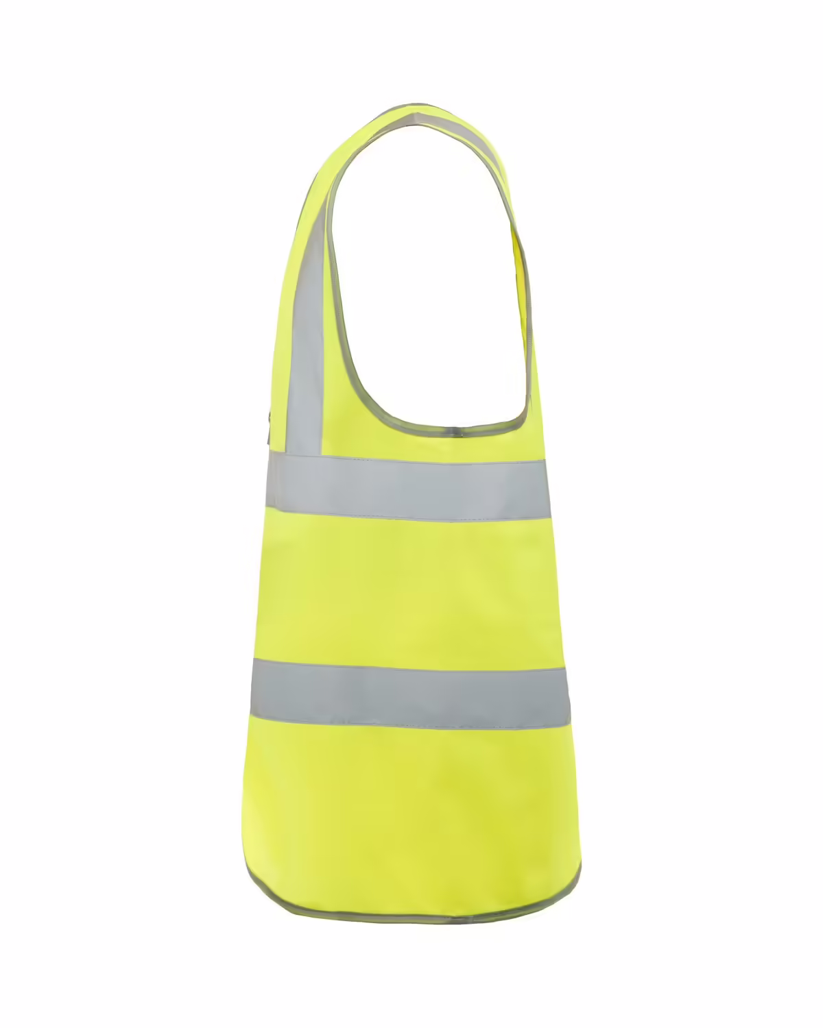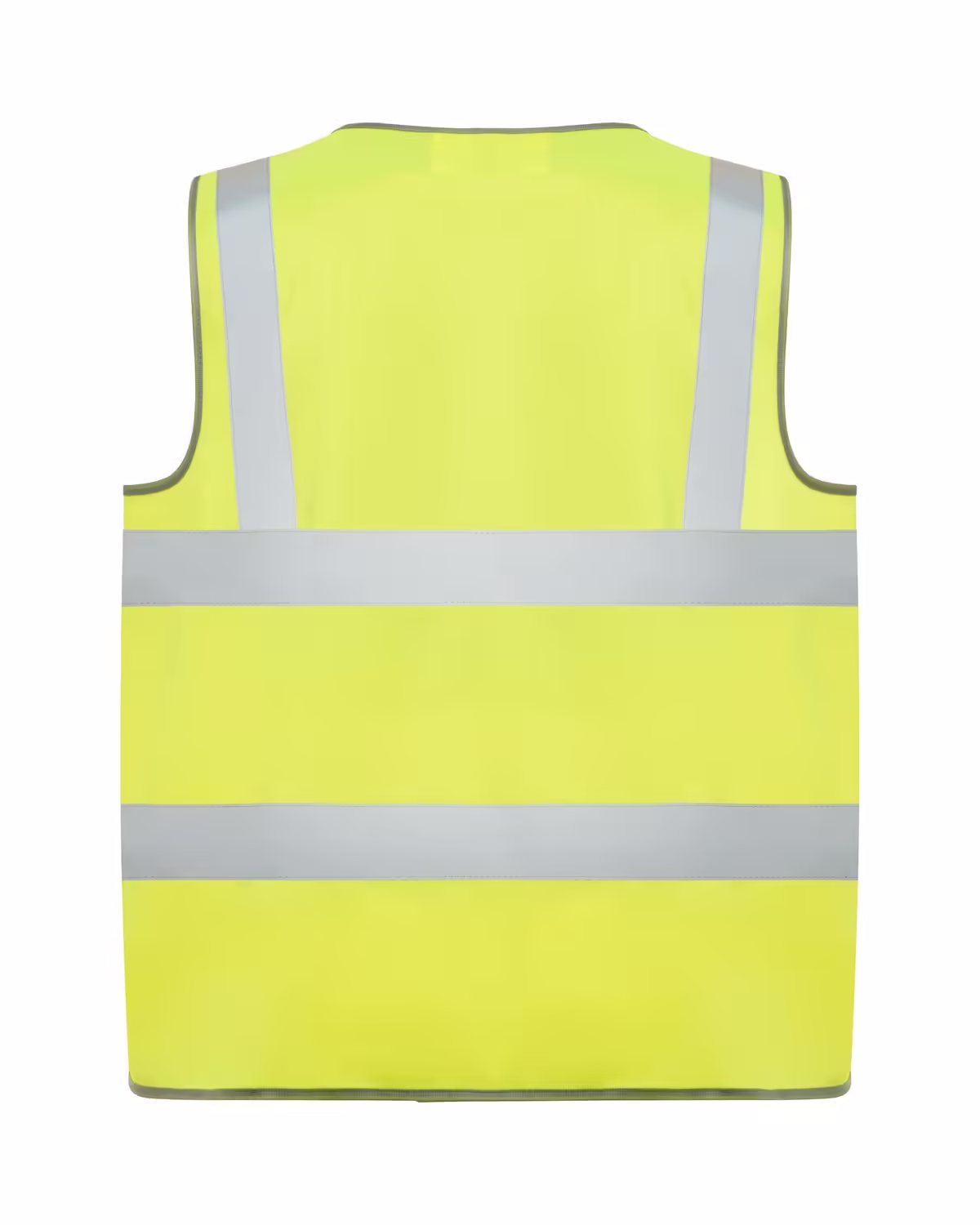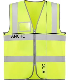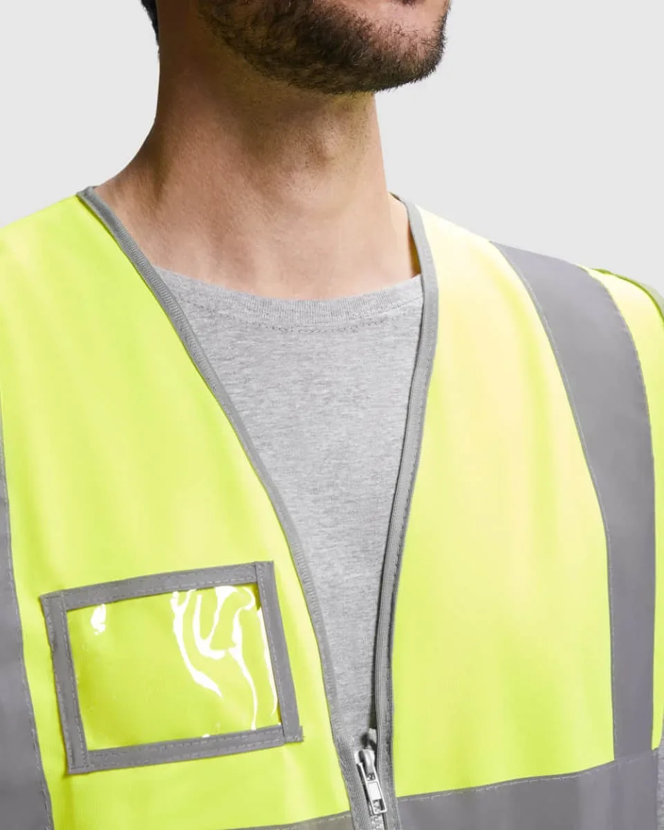 Chaleco de alta visibilidad con cremallera central. Dos bandas reflectantes horizontales en el pecho y bandas verticales en los hombros. Bolsillo en pecho derecho transparente para identificación.